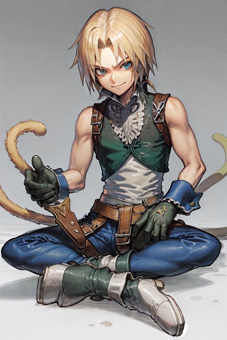 'zidane tribal (final fantasy), vest, pants, gloves, monkey tail, frilled shirt collar, wrist cuffs' example prompt to get his usual outfit.