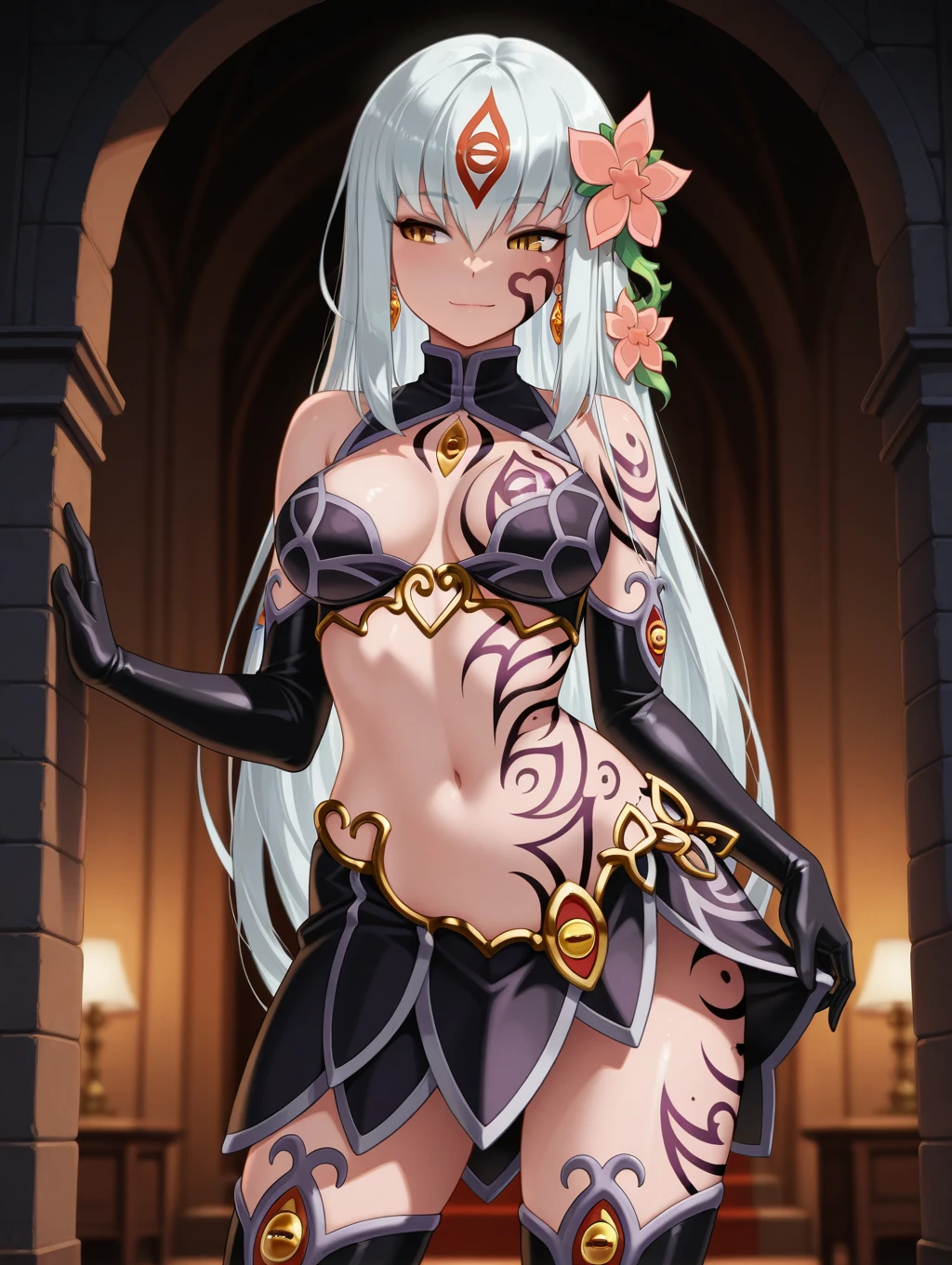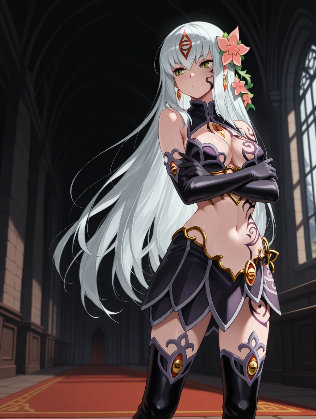 Alipheese, white hair, long hair, yellow eyes, breast tattoo, human, purple tattoos, slit pupils, face tattoo, gloves, elbow gloves, skirt, bra, jewelry, hair ornament, earrings, black thigh_boots,