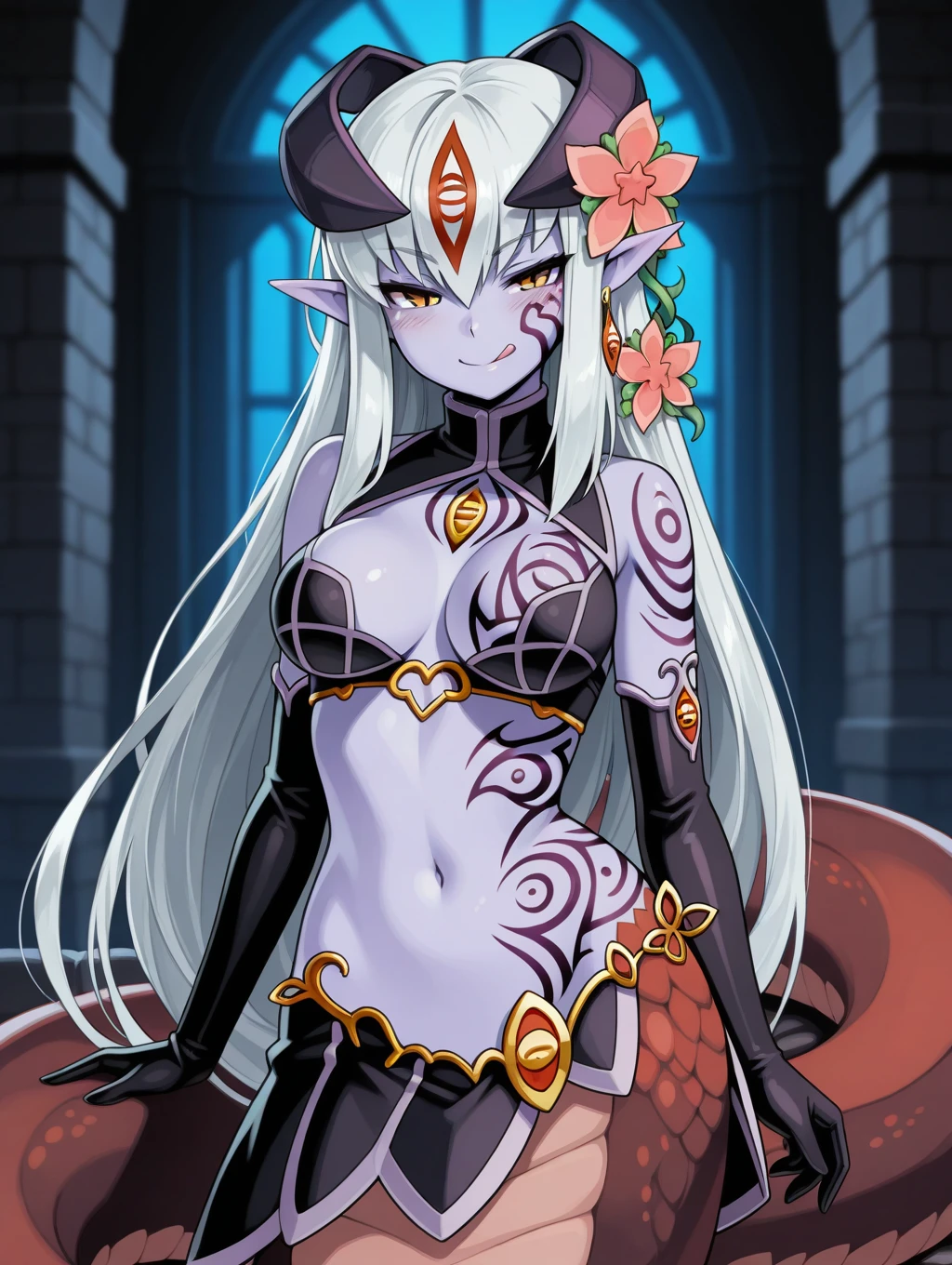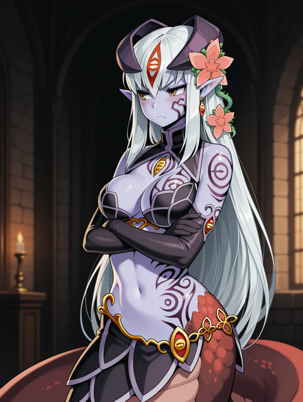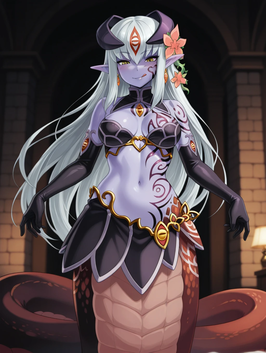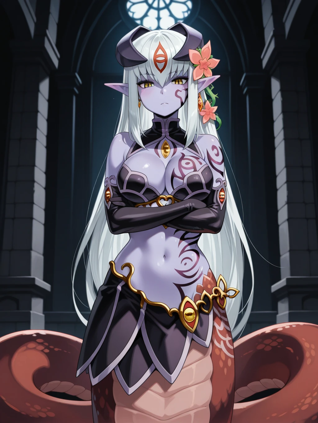 Alipheese, white hair, long hair, lamia, yellow eyes, breast tattoo, monster girl, snake girl, purple tattoos, pointy ears, horns, colored skin, purple skin, slit pupils, scales, face tattoo, gloves, elbow gloves, skirt, bra, jewelry, hair ornament, earrings,