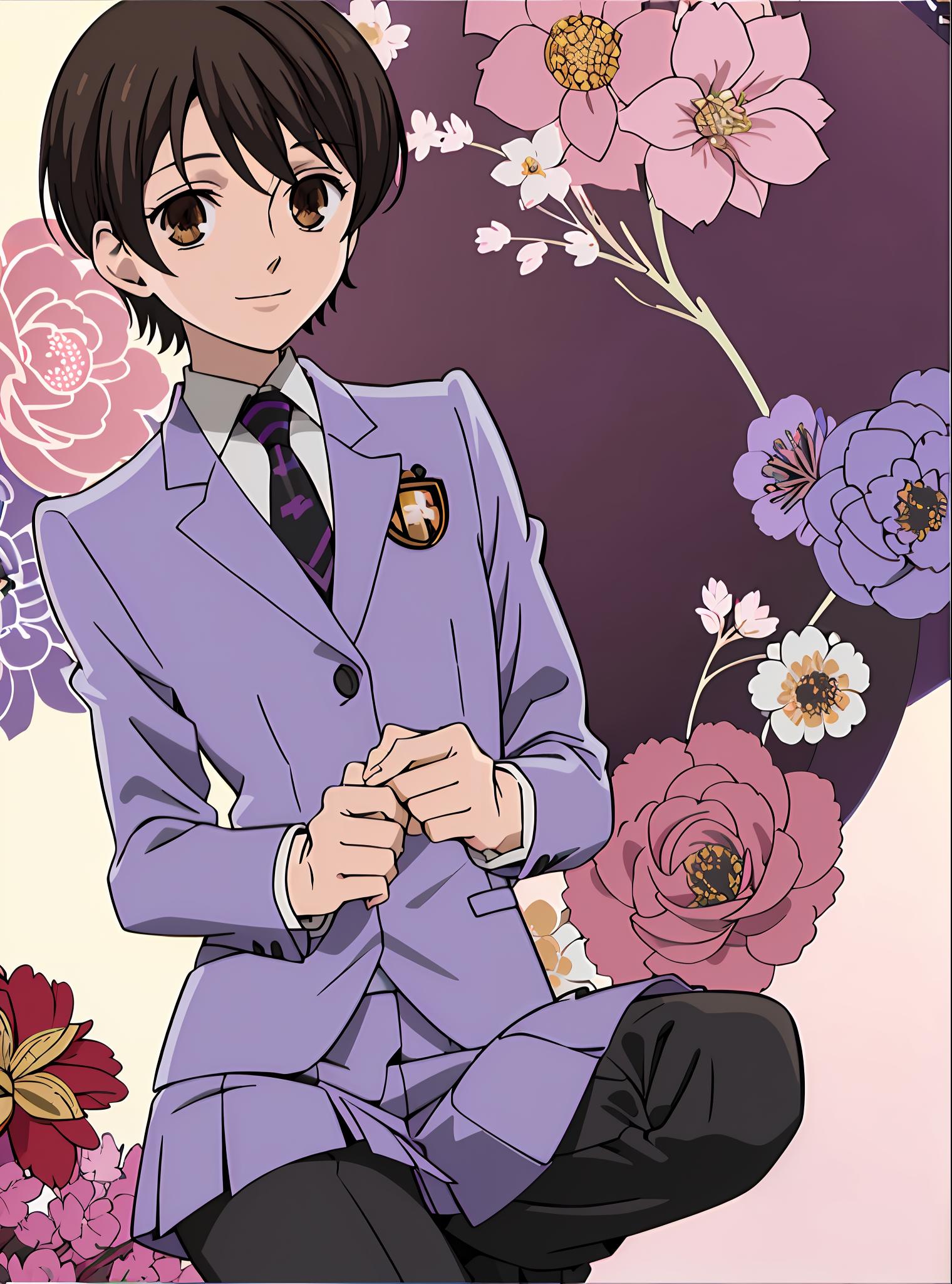 You can specify fujiokaharuhi_(short_hair) or fujiokaharuhi_(long_hair). Also trained on ouran_high_school_uniform.
