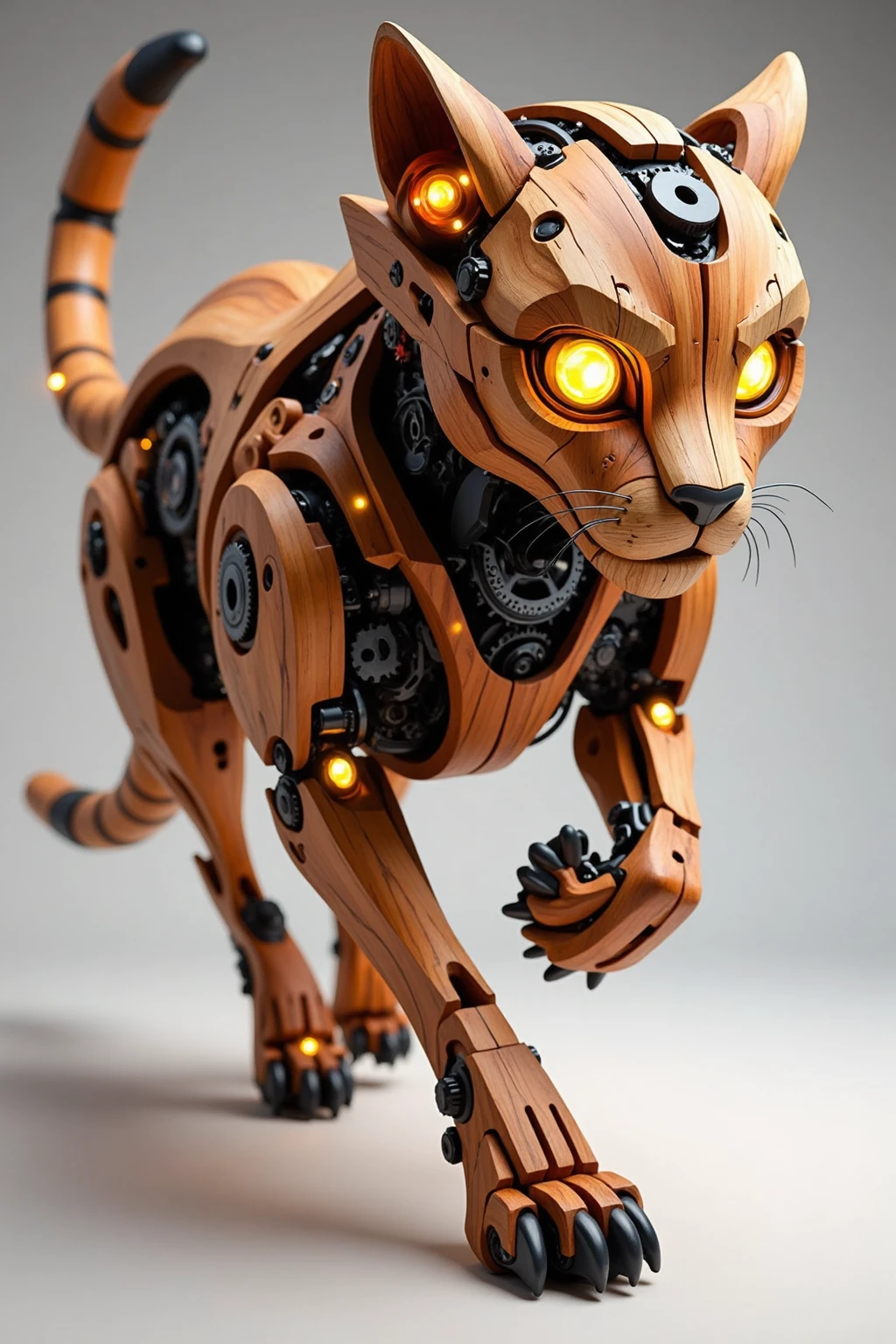 Wooden texture combined with mechanical elements, design a swift cheetah. Wood for sleek form, gears in limbs and face, glowing mechanical accents, dynamic running pose.