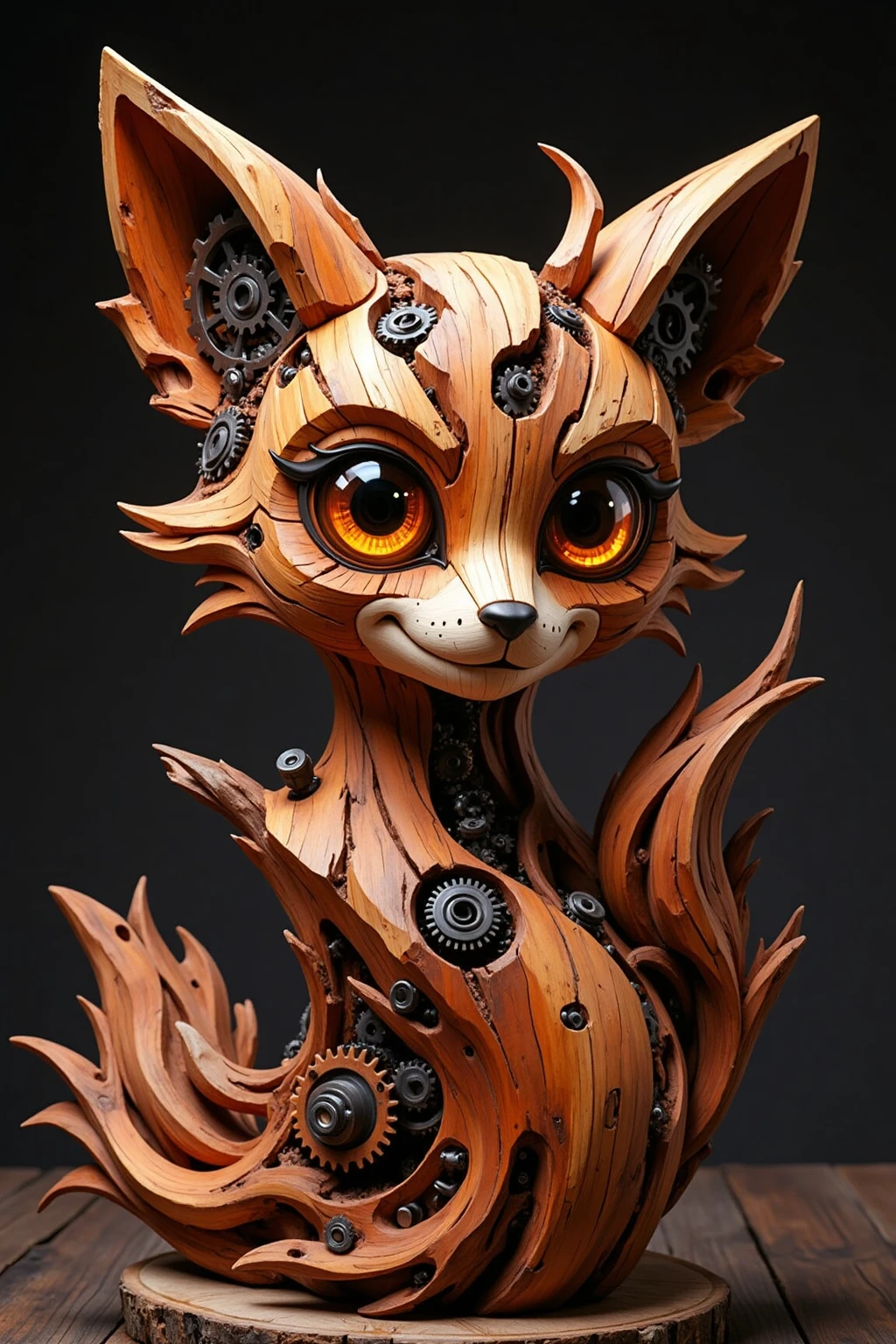 Wooden texture combined with mechanical elements, shape a cunning fox. Wood for fiery coat, gears in tail and ears, sly mechanical eyes, twilight - like setting.