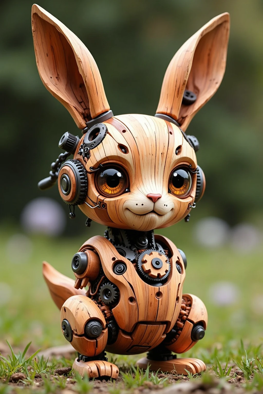 Wooden texture combined with mechanical elements, form a lively rabbit. Delicate wood structure, gear - detailed ears and paws, cute mechanical face, meadow background.