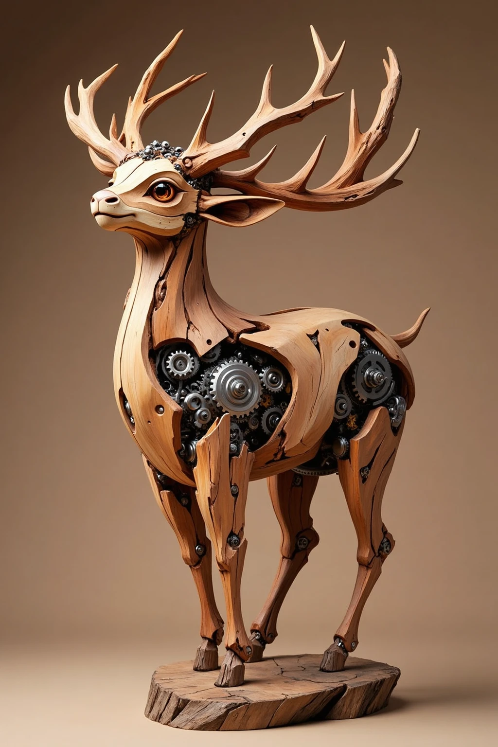 Wooden texture combined with mechanical elements, depict a gentle deer. Wood for antlers and body, gears in joints, soft lighting, natural - inspired mechanical details.
