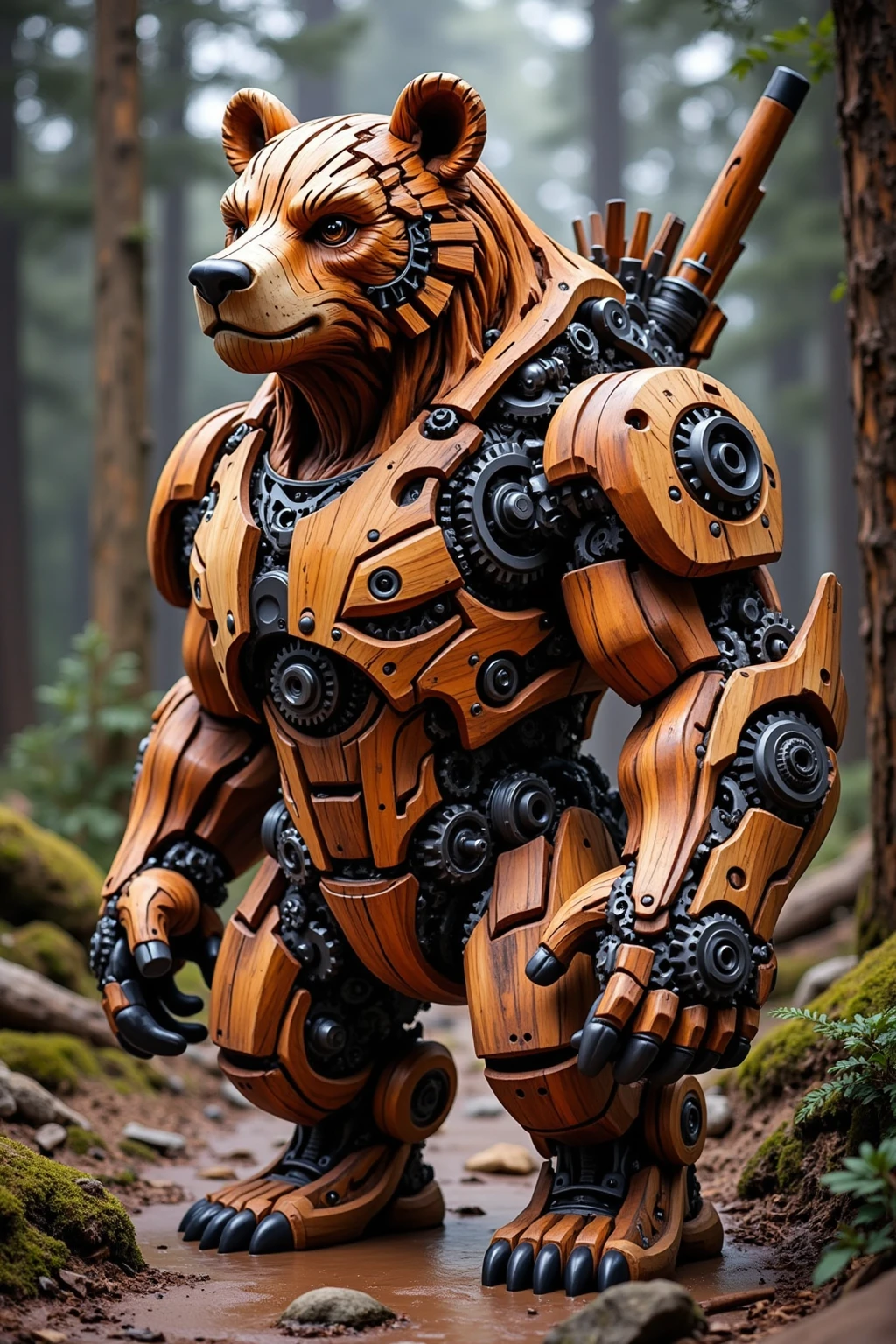 Wooden texture combined with mechanical elements, craft a powerful bear. Rugged wood surface, large gear - filled paws, mechanical snout, forest - themed backdrop.