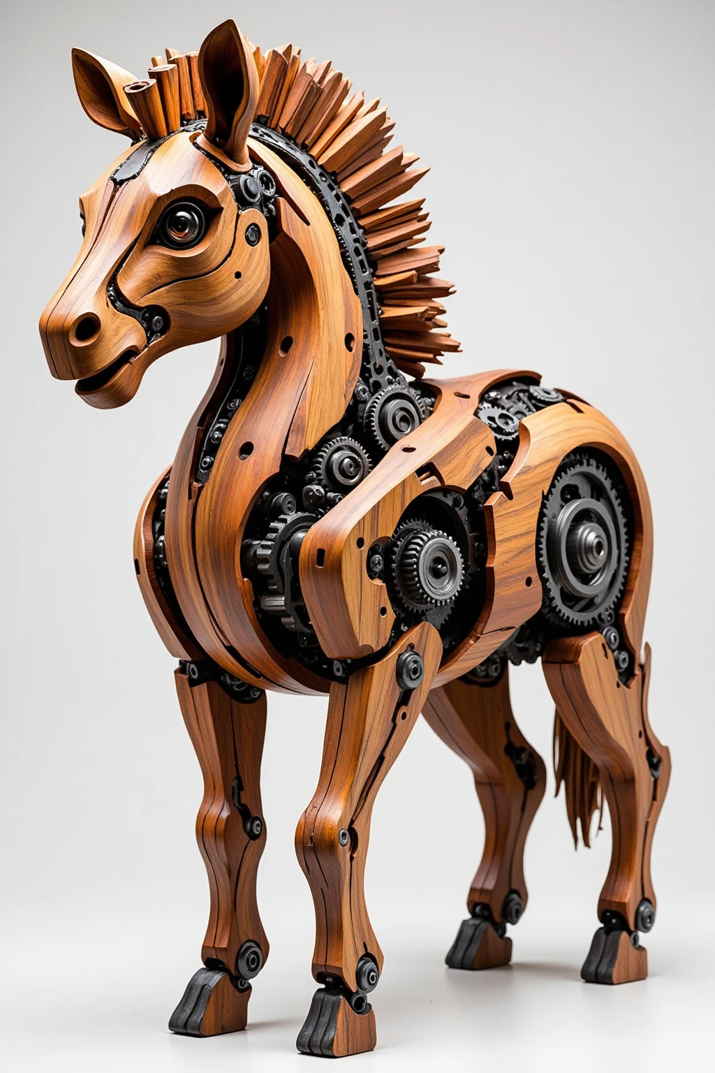 Wooden texture combined with mechanical elements, create a bold zebra. Striped wood body, gears in stripes and mane, mechanical hooves, African plain - inspired.