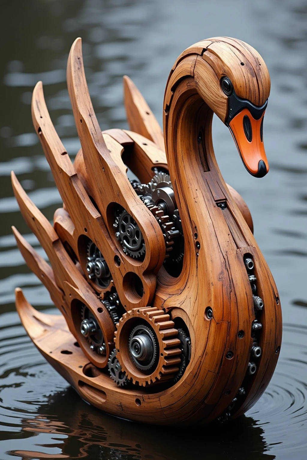 Wooden texture combined with mechanical elements, make a graceful swan. Smooth wood curves, gear - adorned wings, elegant neck with mechanical parts, serene water background.