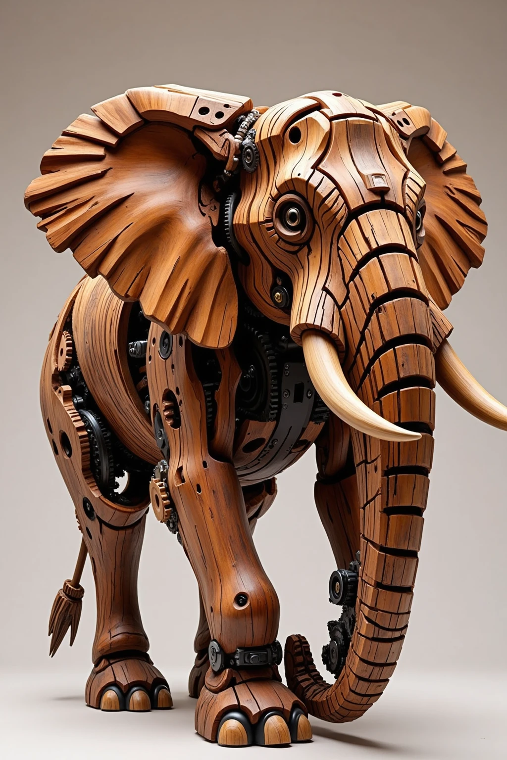 Wooden texture combined with mechanical elements, build a sturdy elephant. Massive wood body, gear - driven tusks and trunk, mechanical feet, savanna - style scene.