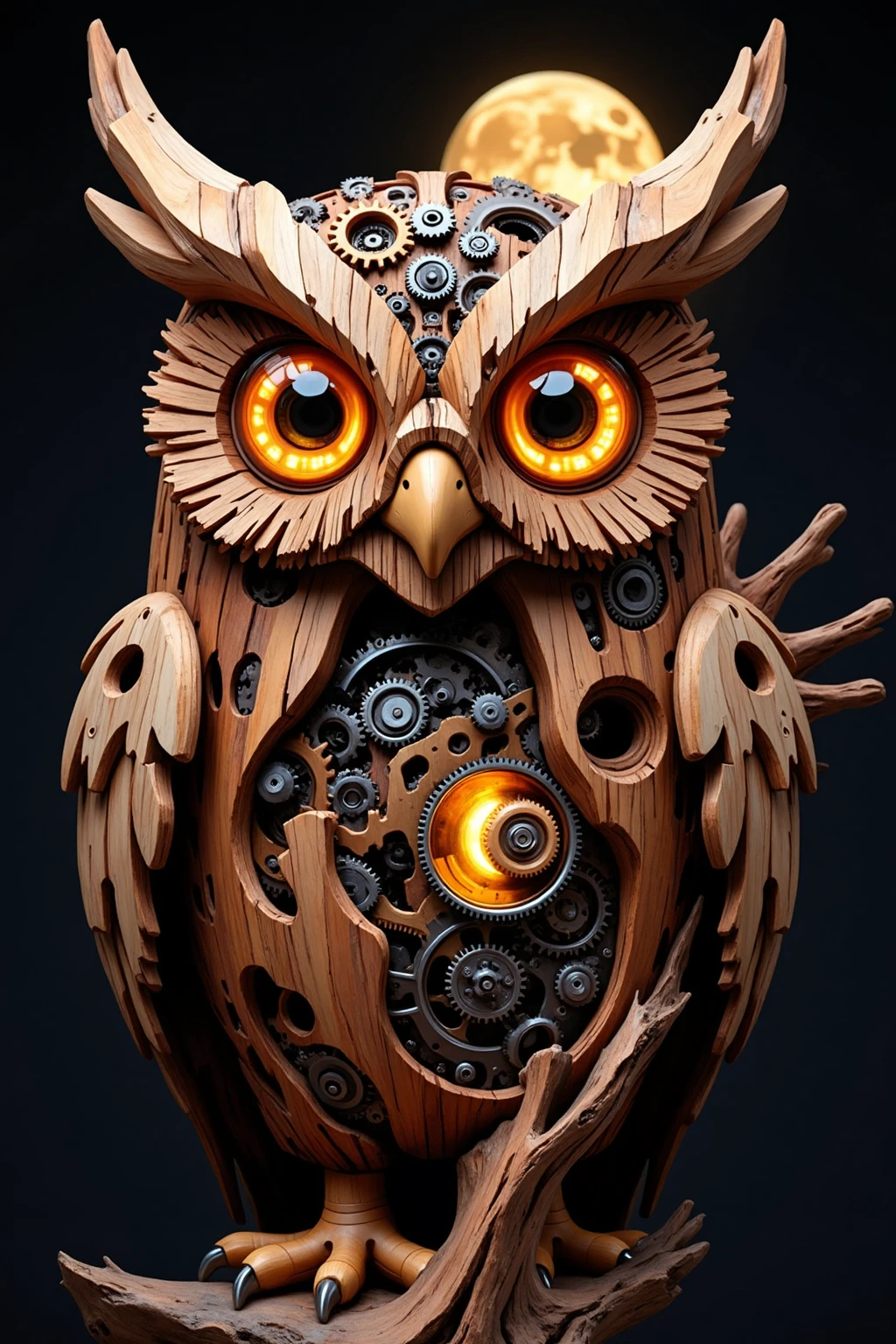 Wooden texture combined with mechanical elements, design a mysterious owl. Wood for feather patterns, gear - filled eyes and wings, nocturnal mechanical glow, moonlit tree.