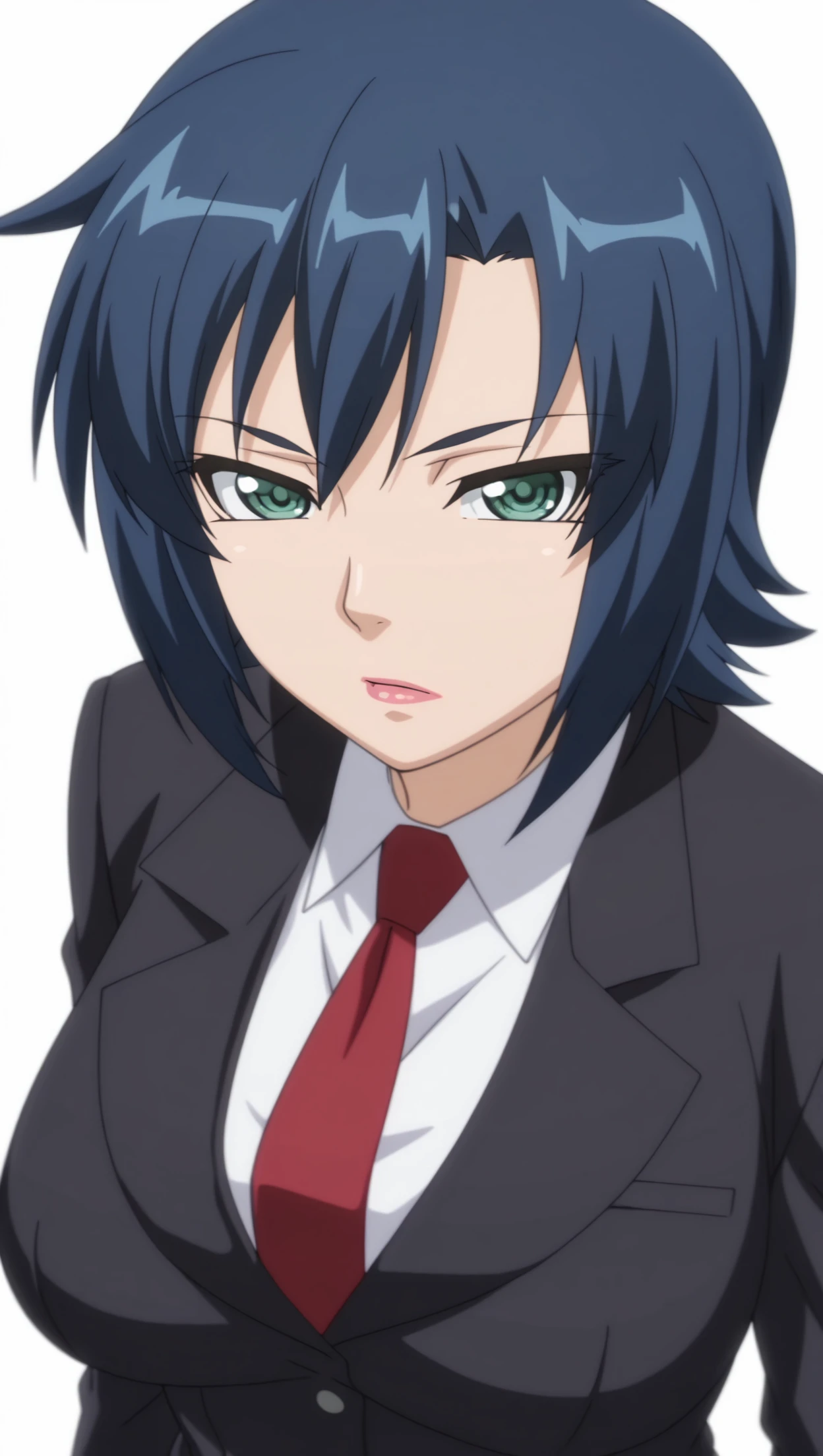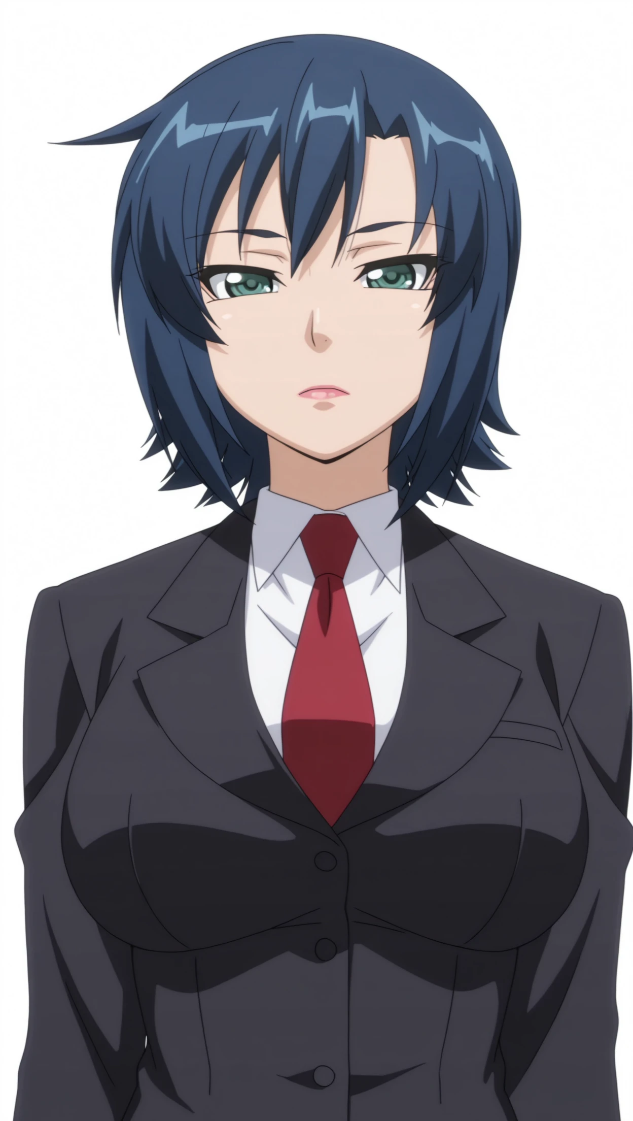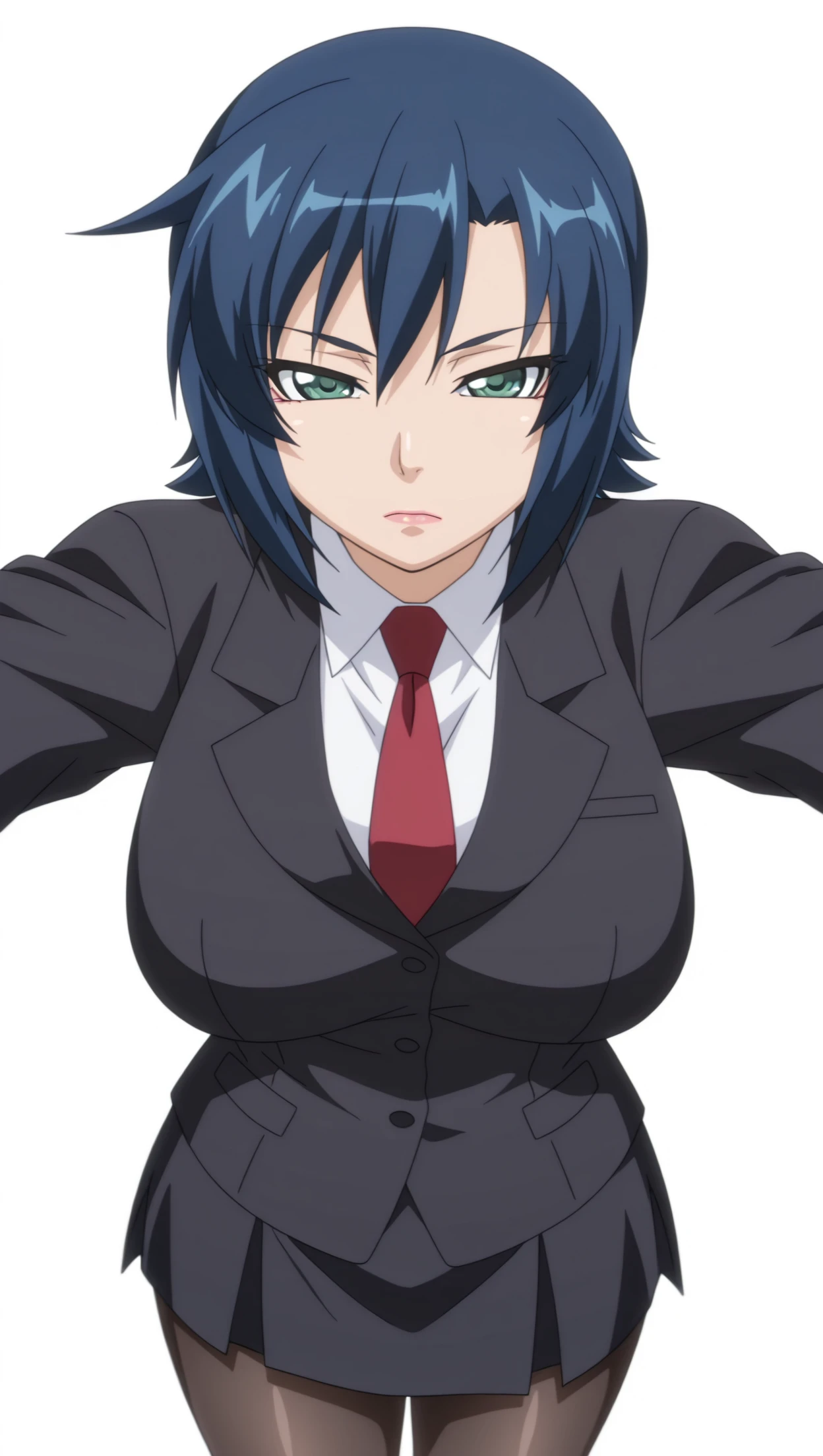 anime coloring, masterpiece, best quality, amazing quality, kazamarin, 1girl, short hair, blue hair, green eyes, jacket, black jacket, shirt, white shirt, collared shirt, necktie, skirt, black skirt, pantyhose, solo, pose, standing, looking at viewer, from front, ((((white background, simple background))))