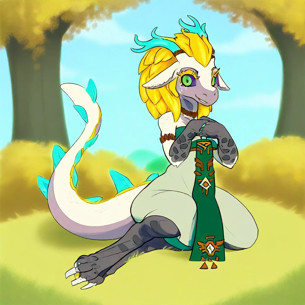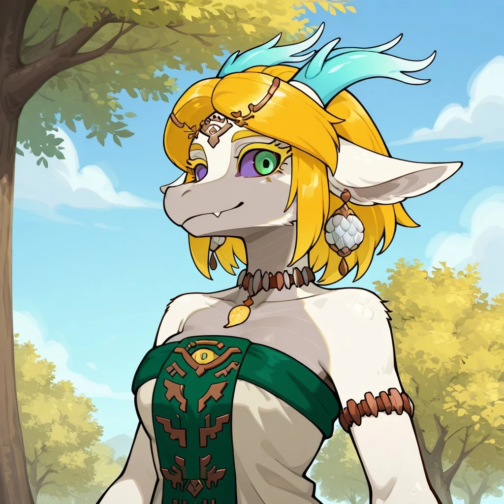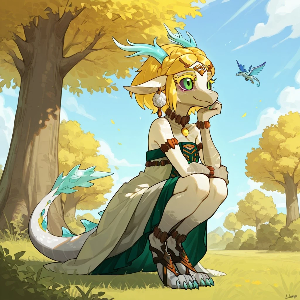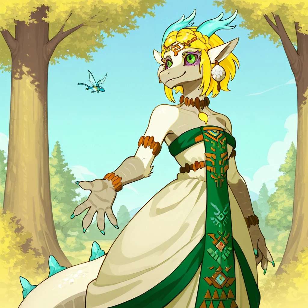 LD(character), Zelda, dragon, anthro, blonde hair, female,blue horns, Top braid,