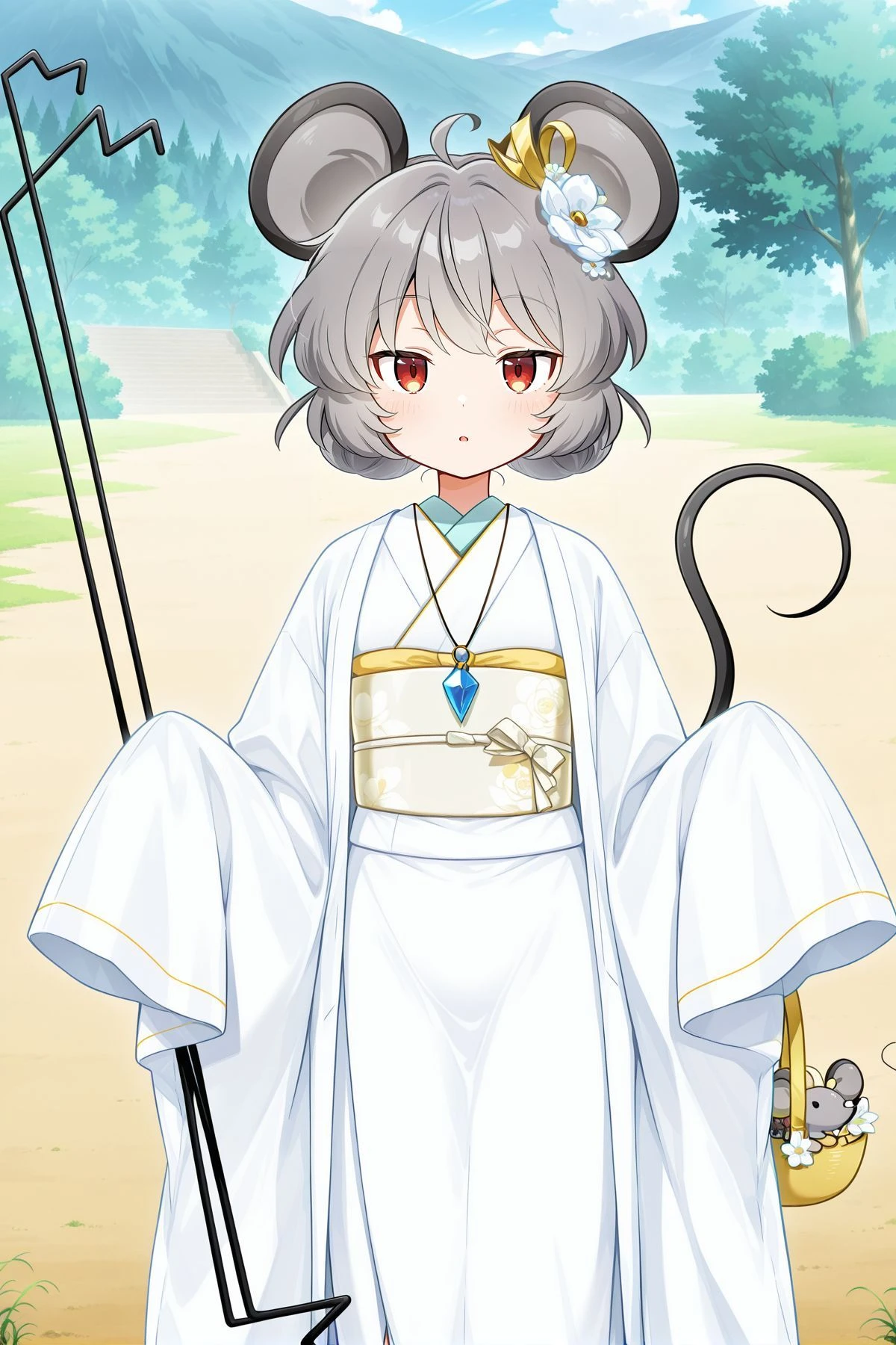 nazrin, 1girl, solo, red eyes, grey hair, short hair, mouse ears, mouse tail, nazrin \(white mouse searching for whats been lost\), alternate costume, ahoge, hair flower, hair ornament, pendant, blue gemstone, japanese clothes, white kimono, wide sleeves, sleeves past fingers, sleeves past wrists, silver obi, gold obijime, gold obiage, white sash, basket, white flower, white dowsing rod,