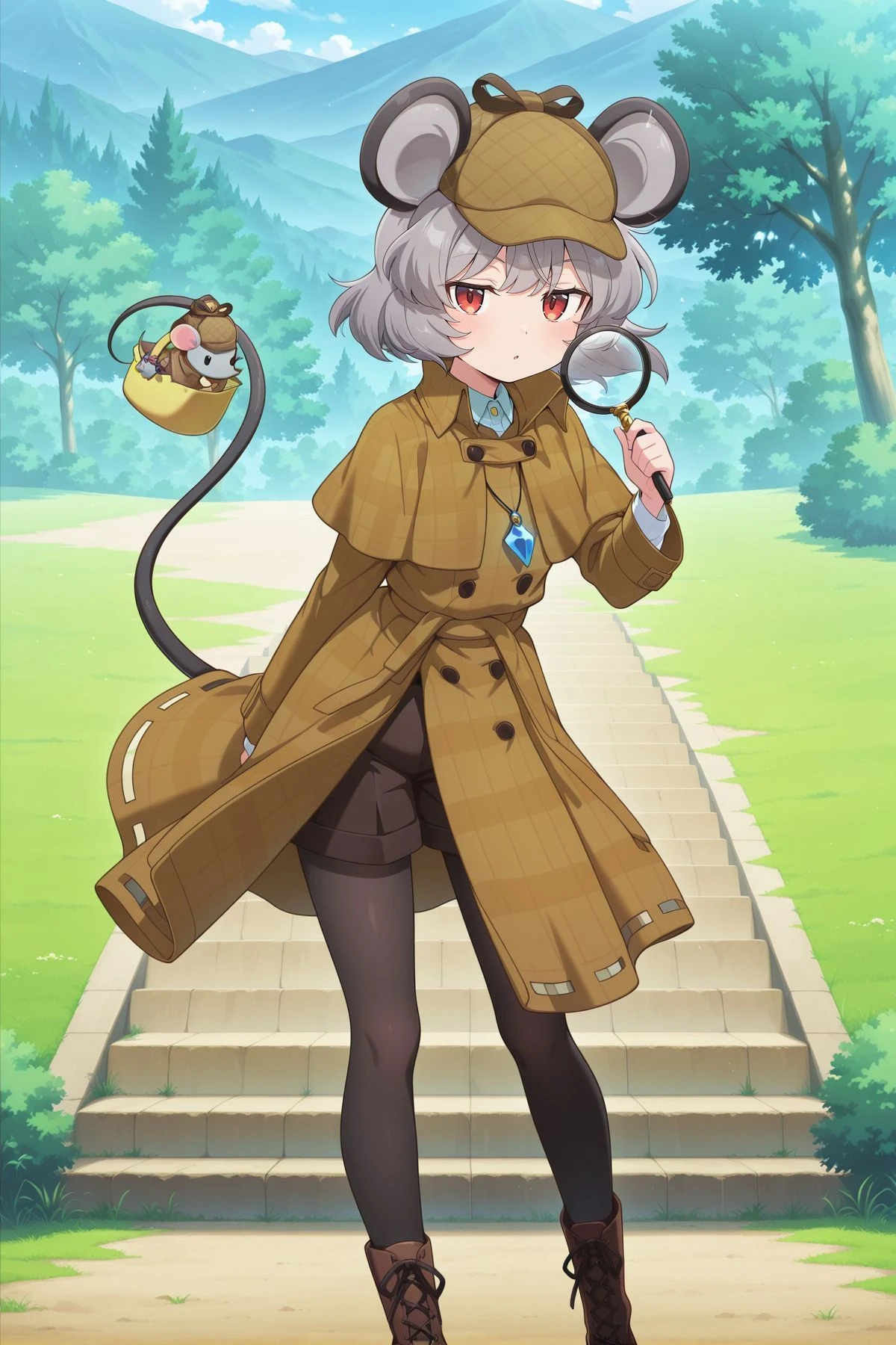nazrin, 1girl, solo, red eyes, grey hair, short hair, mouse ears, mouse tail, nazrin \(genius mouse detective\), alternate costume, brown hat, deerstalker, plaid hat, pendant, blue gemstone, detective, brown capelet, collared capelet, plaid capelet, brown coat, plaid coat, long sleeves, collared shirt, black shorts, black pantyhose, brown boots, lace-up boots, holding, magnifying glass,