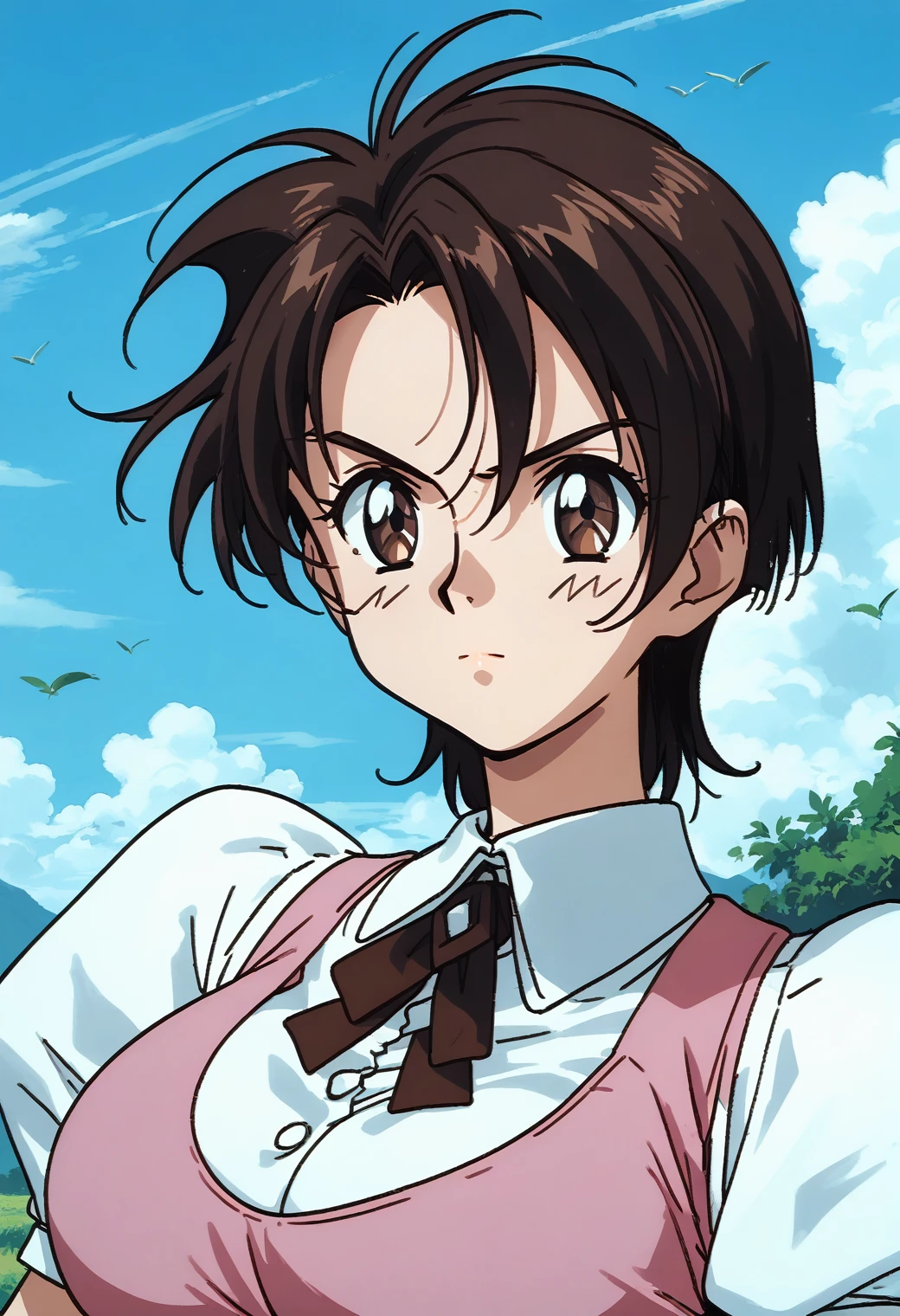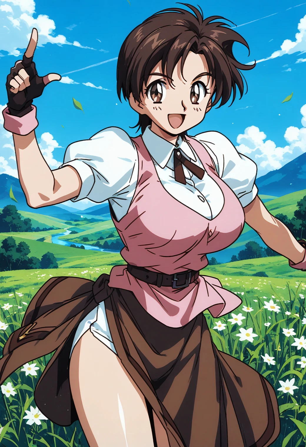 vg_satomi, brown eyes, brown hair, short hair, fingerless gloves, pink vest, puffy short sleeves, belt, brown skirt, side slit,