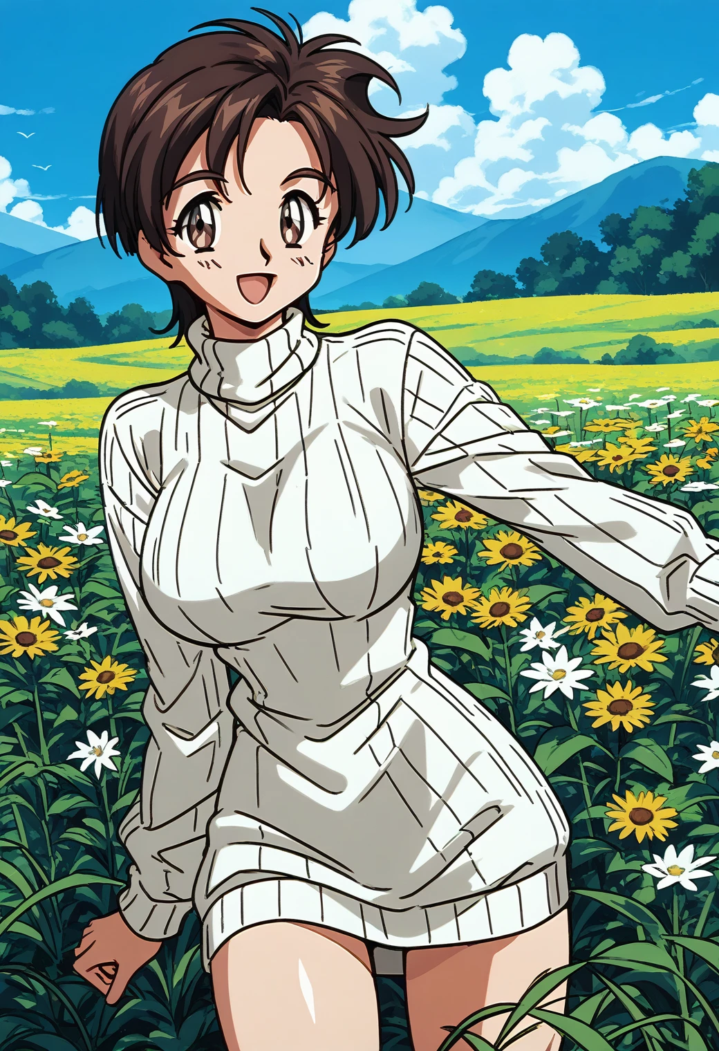 costume2: sweater dress, white sweater, turtleneck, ribbed sweater, long sleeves,