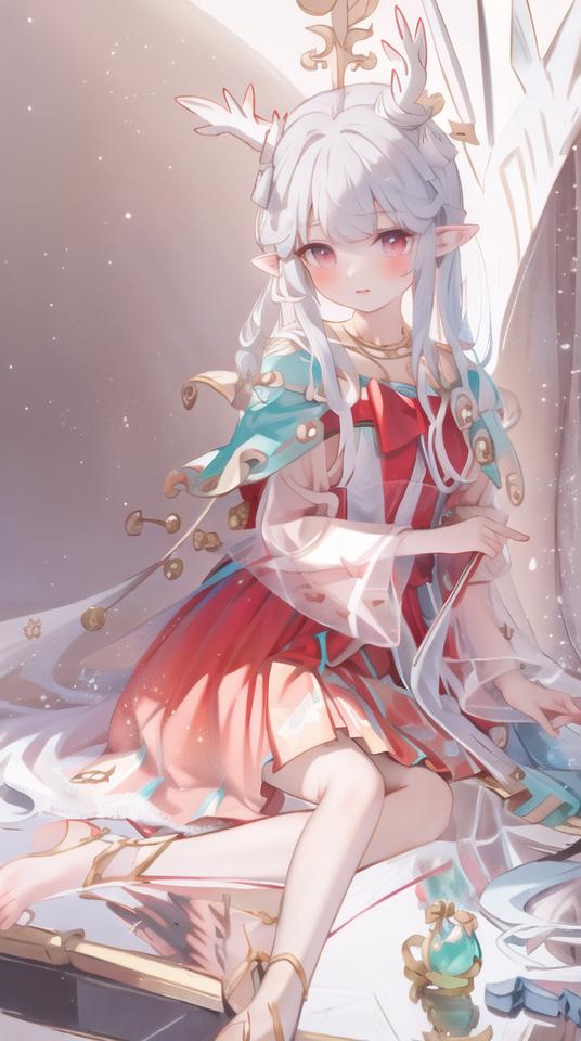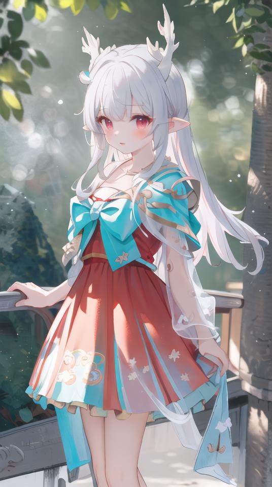 1girl,yaoyao,silver hair,dress,pointy ears,blue capelet,white horns,bow,