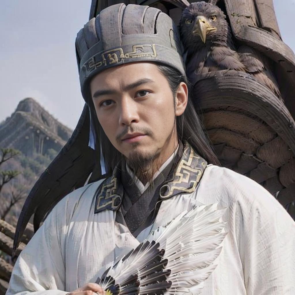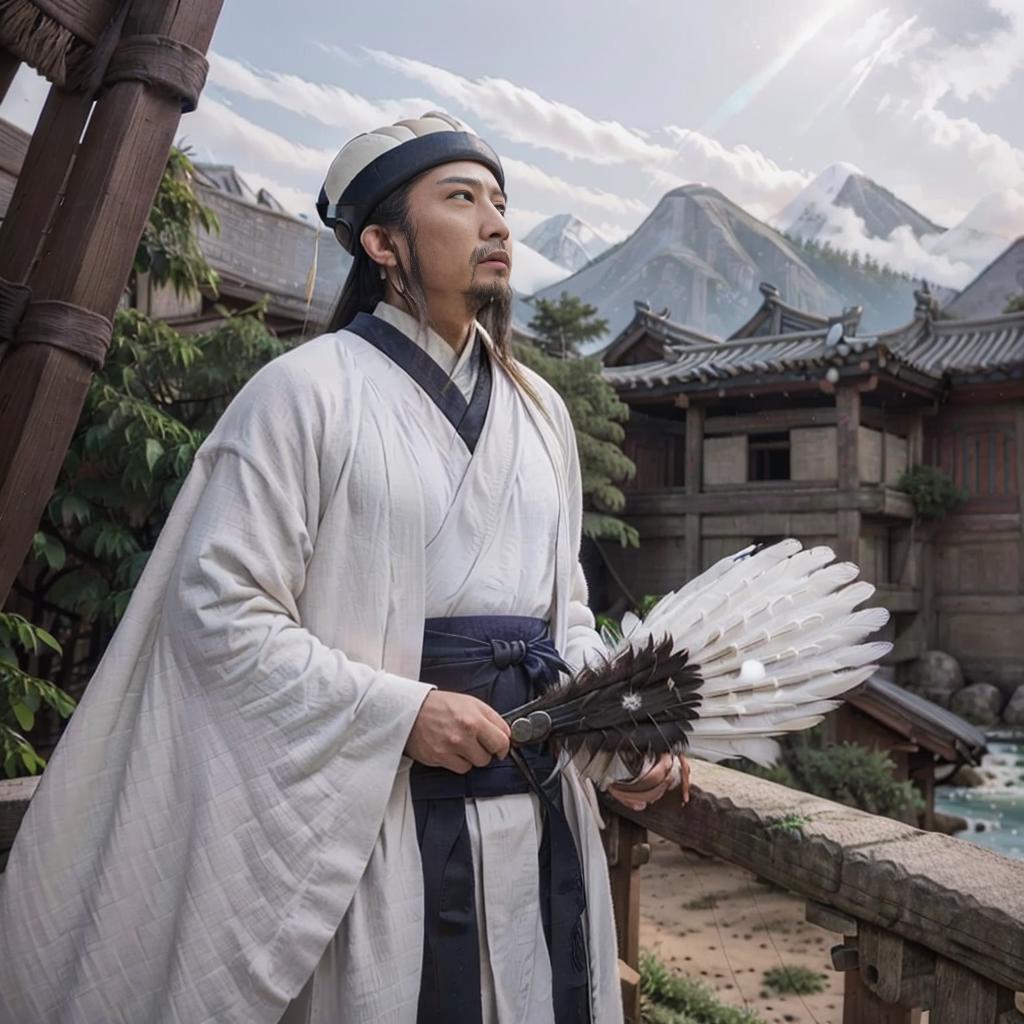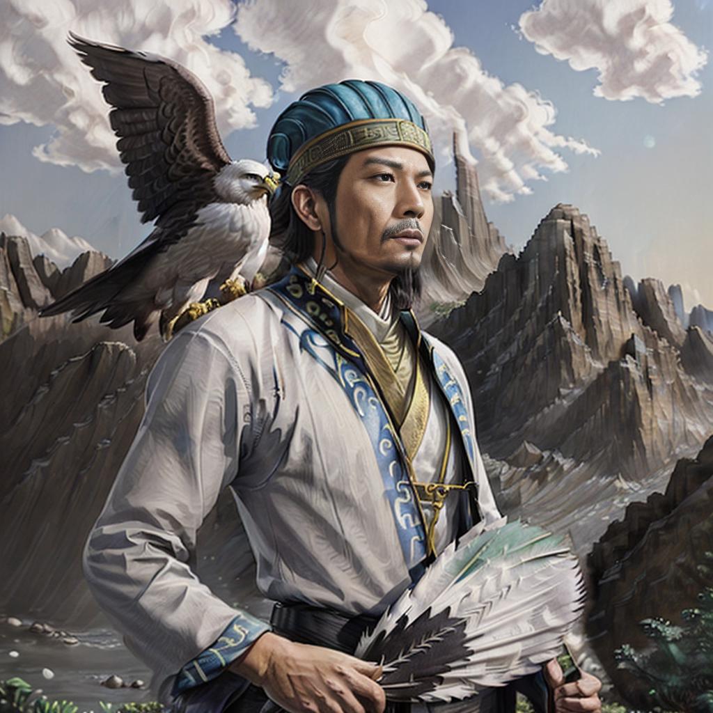 kongming suit, Chinese traditional hat, robe, feather fan, 1boy, bird, male focus, beard, facial hair, solo, hand fan, hat, snow, snowing, tree, mustache, kongming, holding feather fan