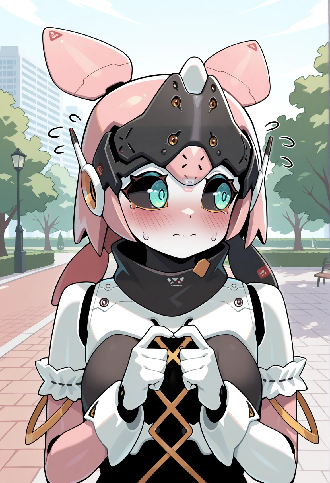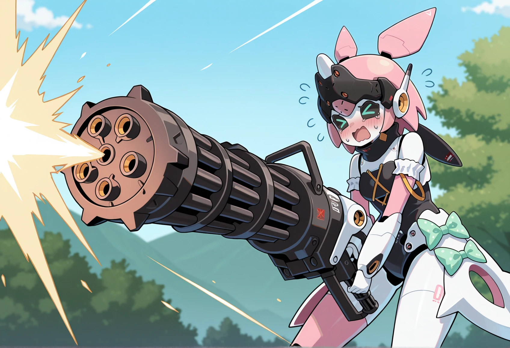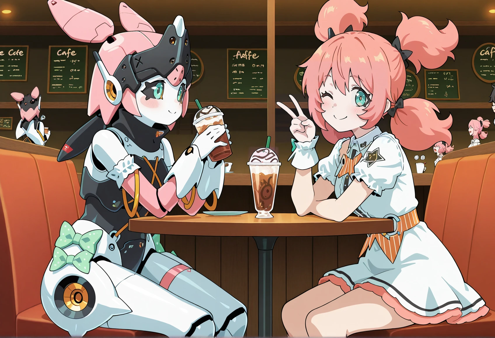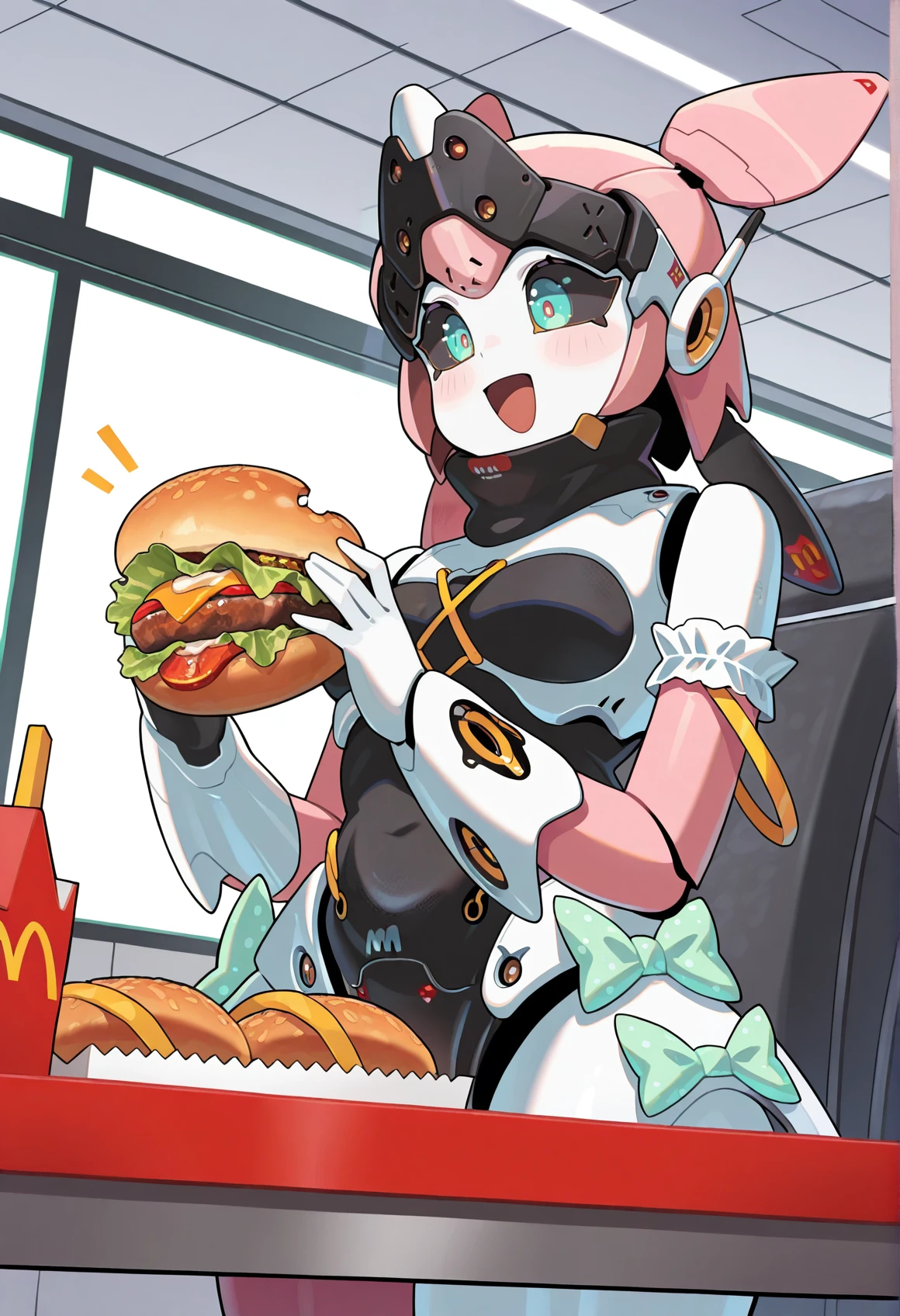 Notable tags: robot girl, humanoid robot, robot joints, metal skin, aqua eyes, black sclera, mechanical hair, robot ears, green bow, armlet, frills