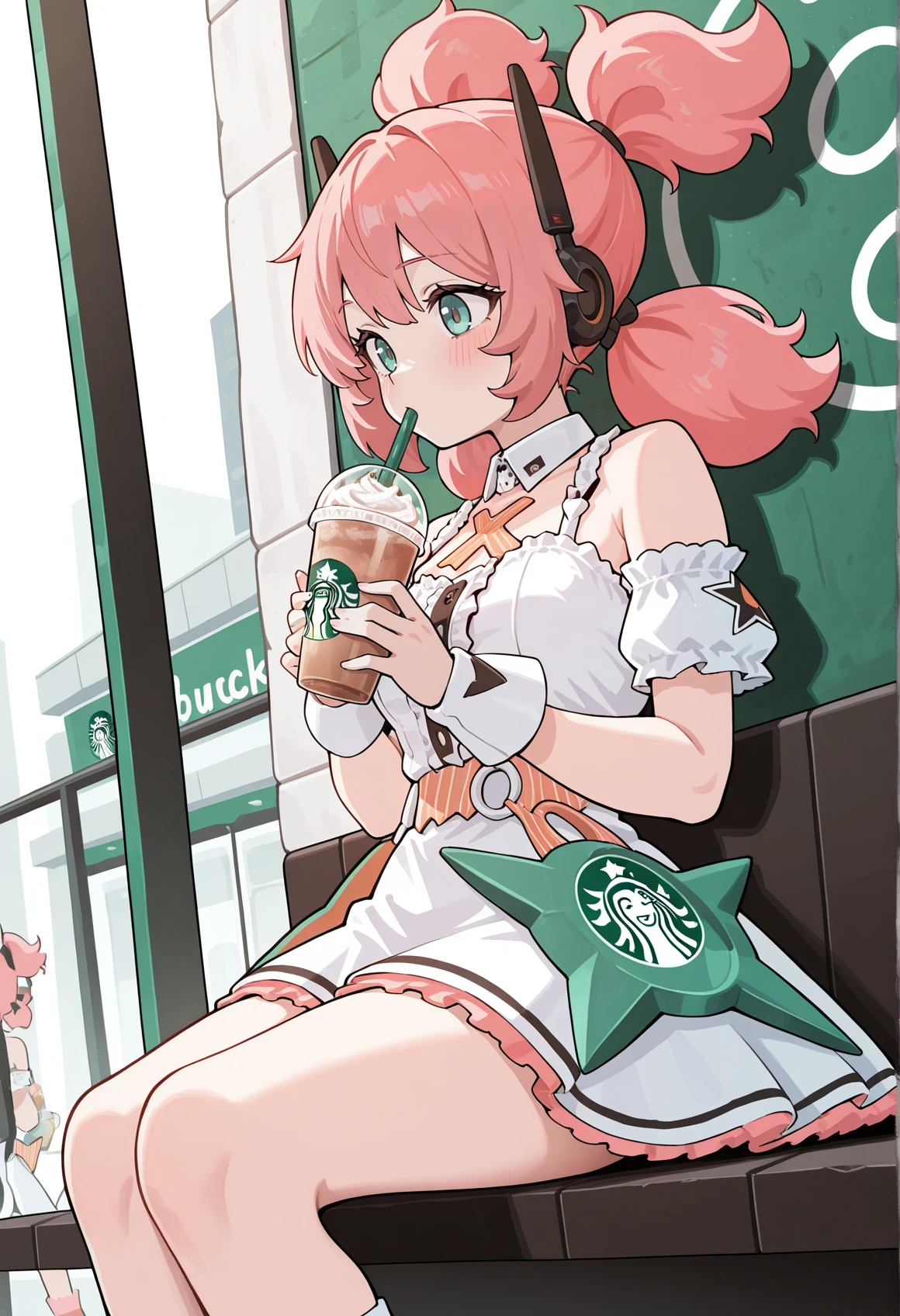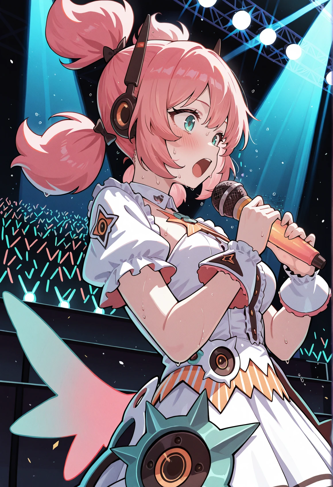 idol, short dress, white dress, pink hair, aqua eyes, quad tails