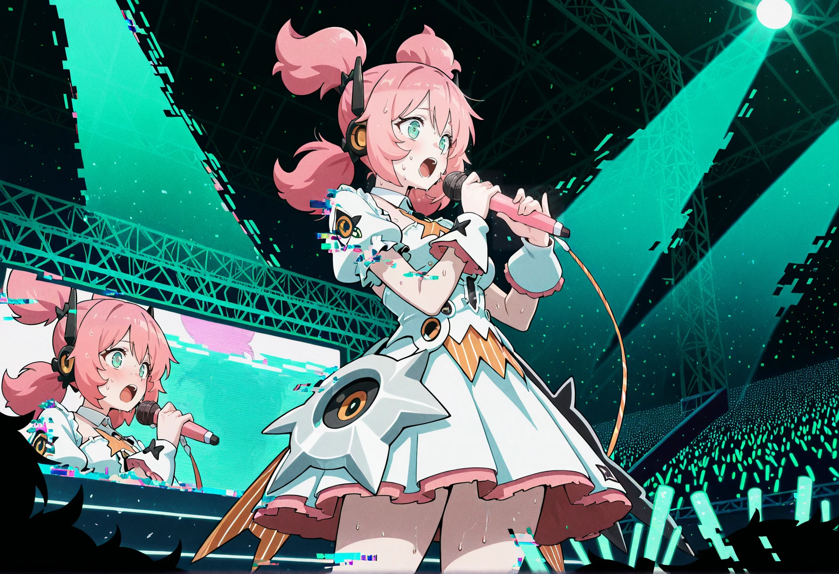 Hologram: idol, short dress, white dress, pink hair, aqua eyes, quad tails