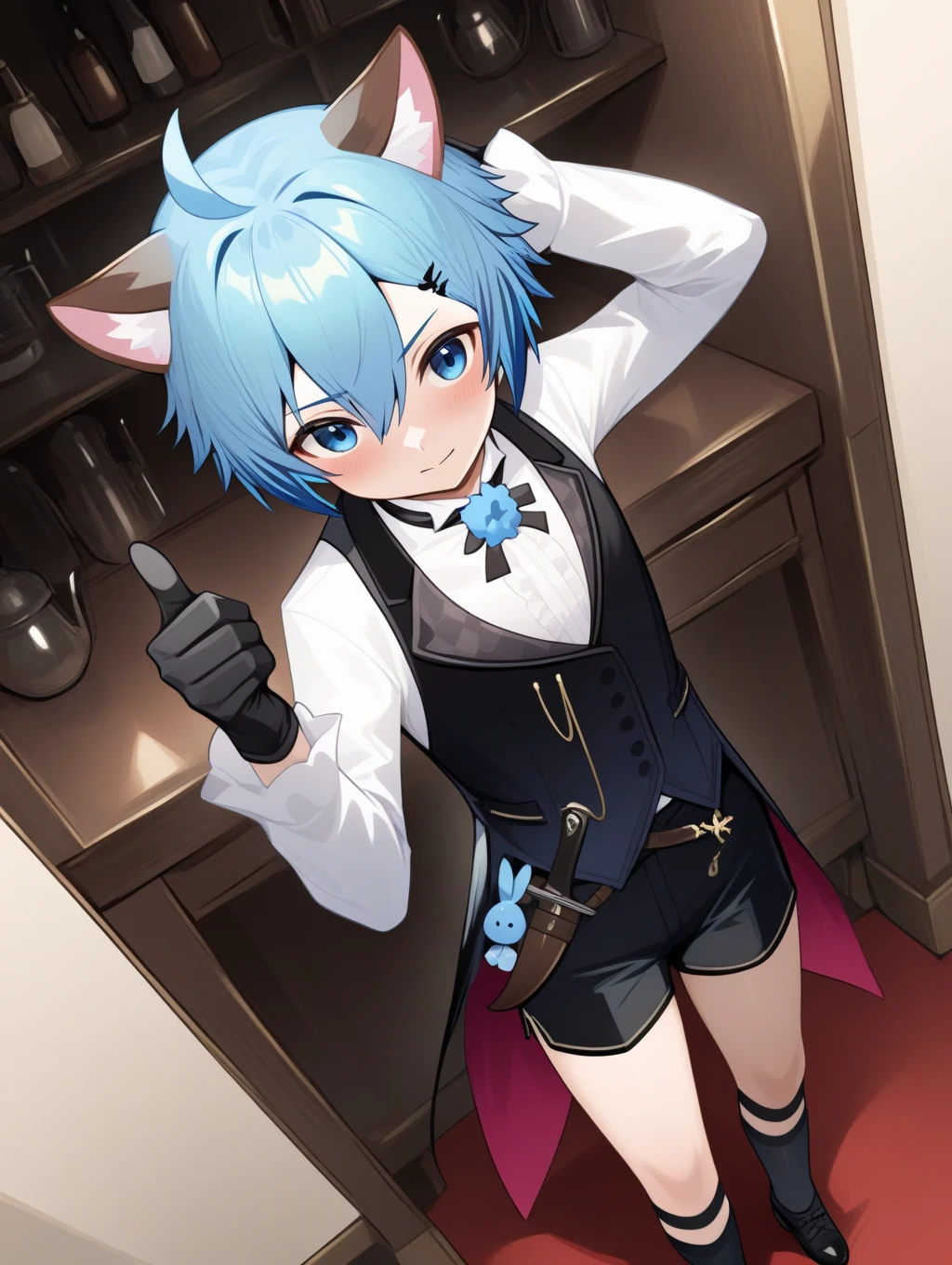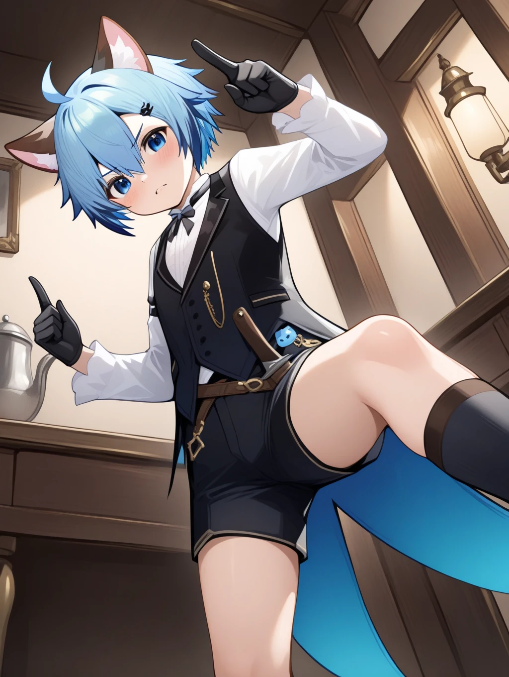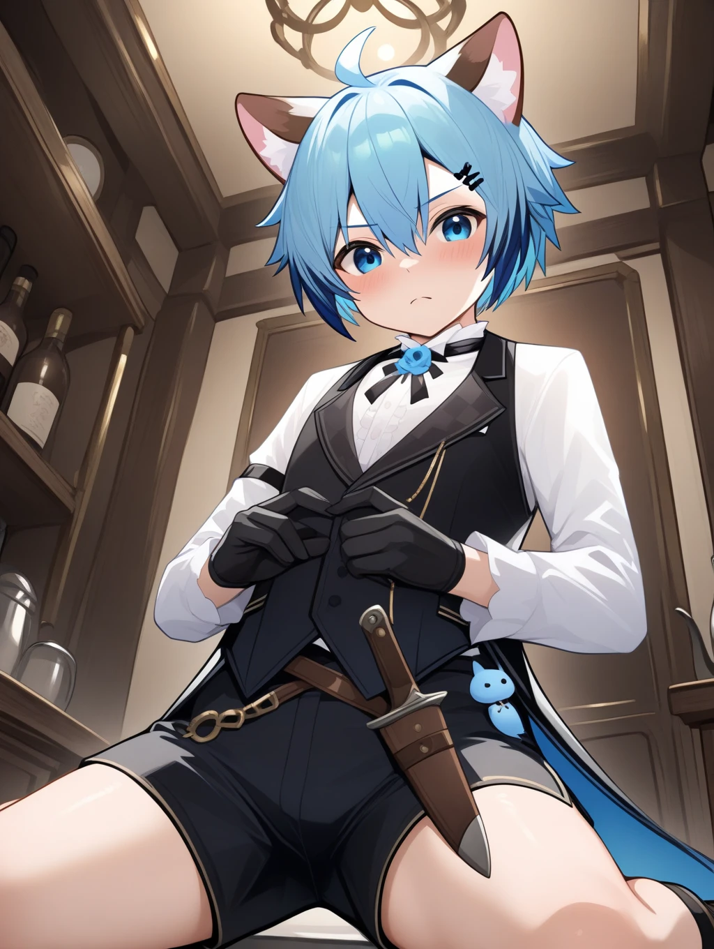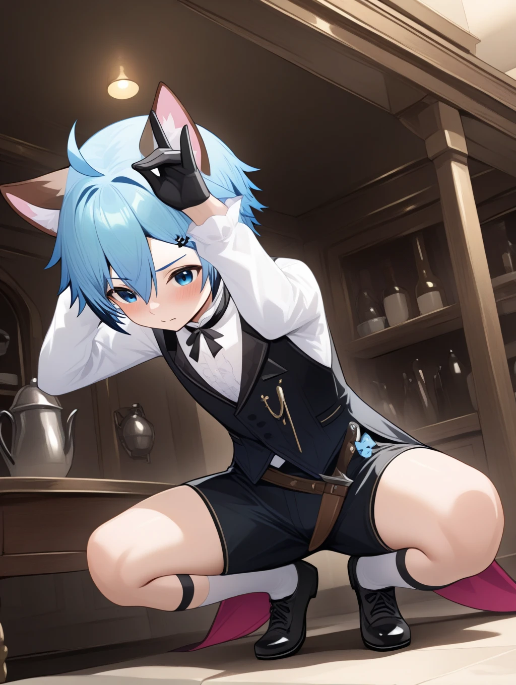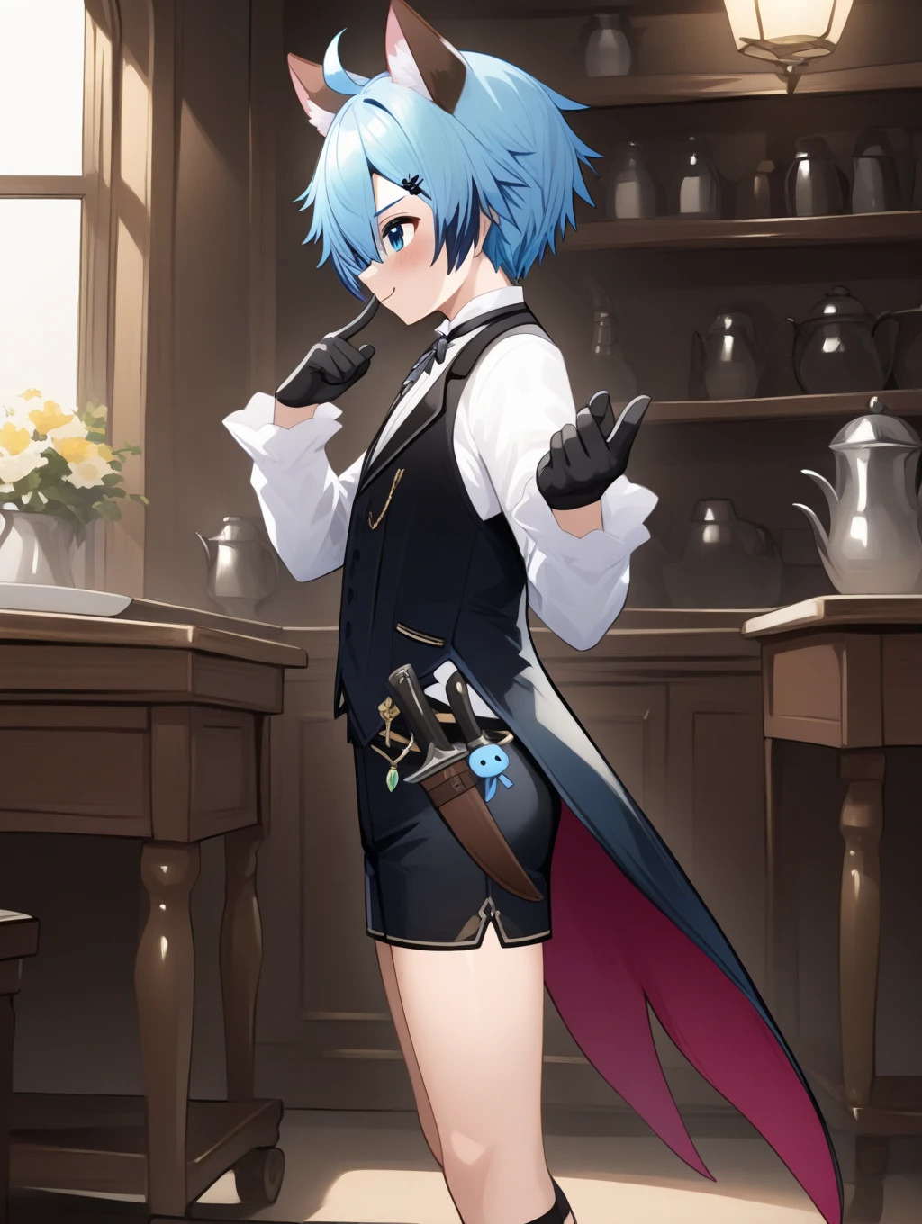 prompt example :situji,blue hair,animal ears,butler,black gloves,short shorts,knife,