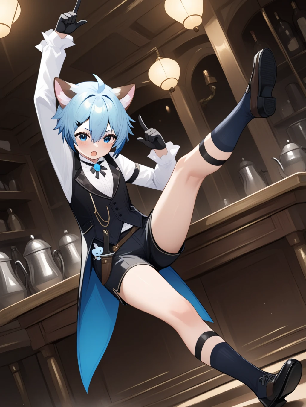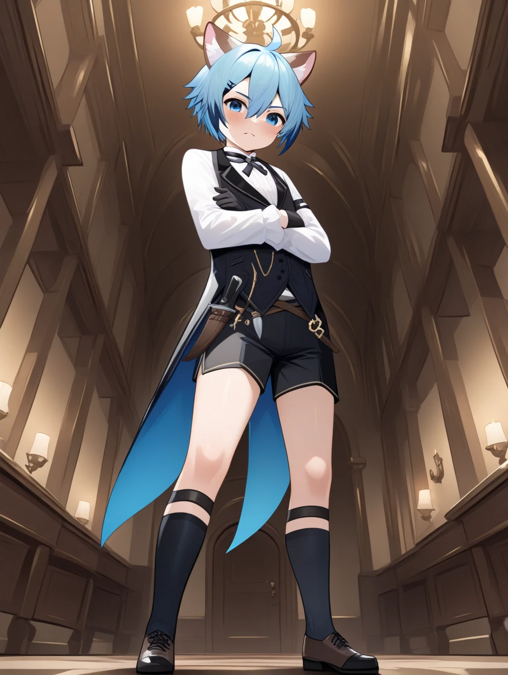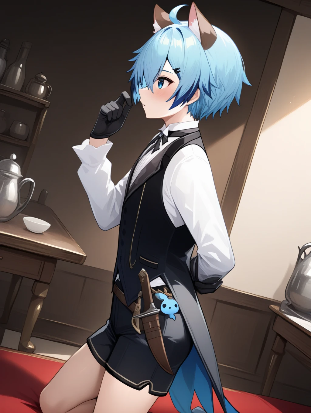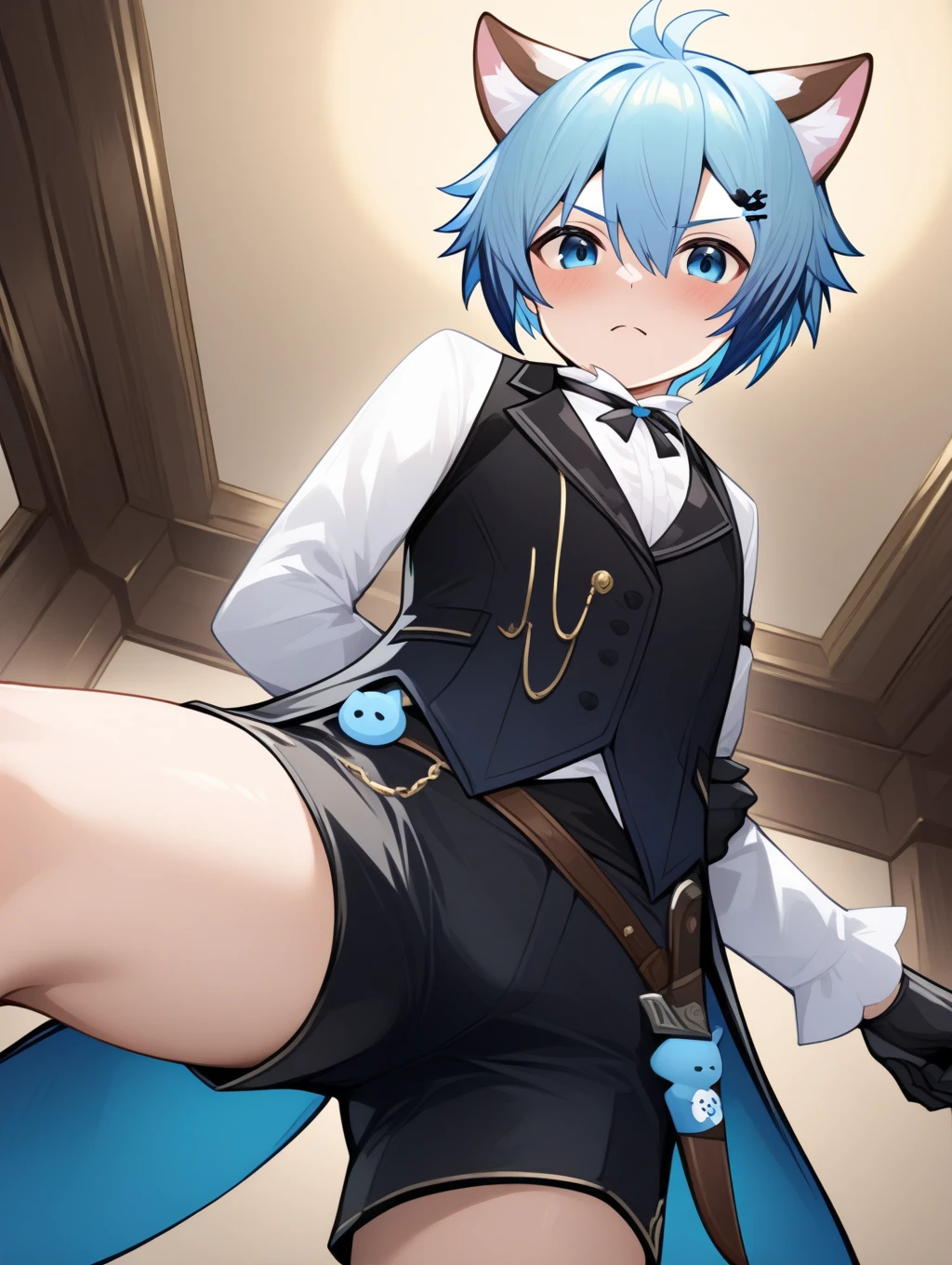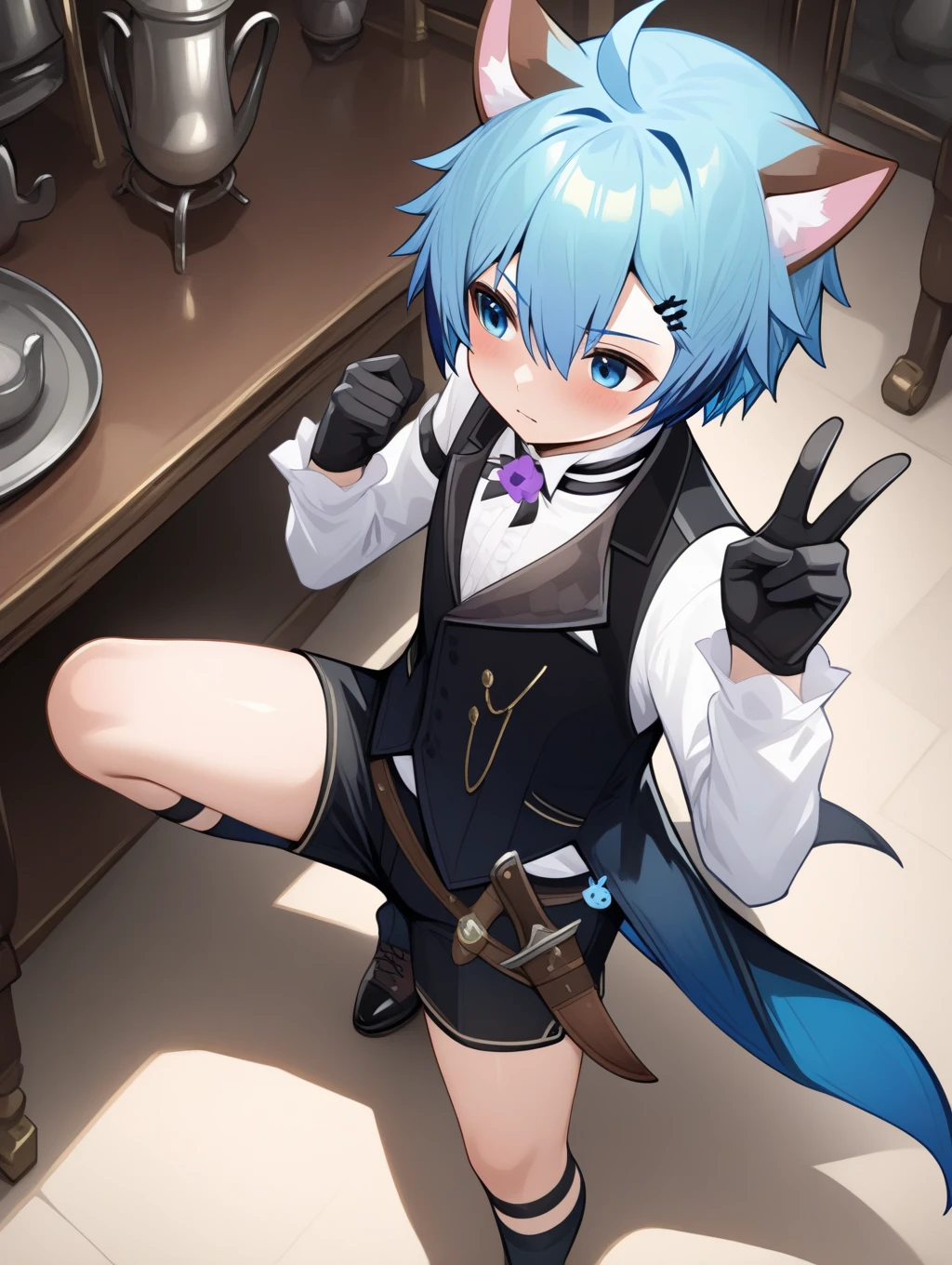 prompt example :situji,blue hair,animal ears,butler,black gloves,short shorts,knife,