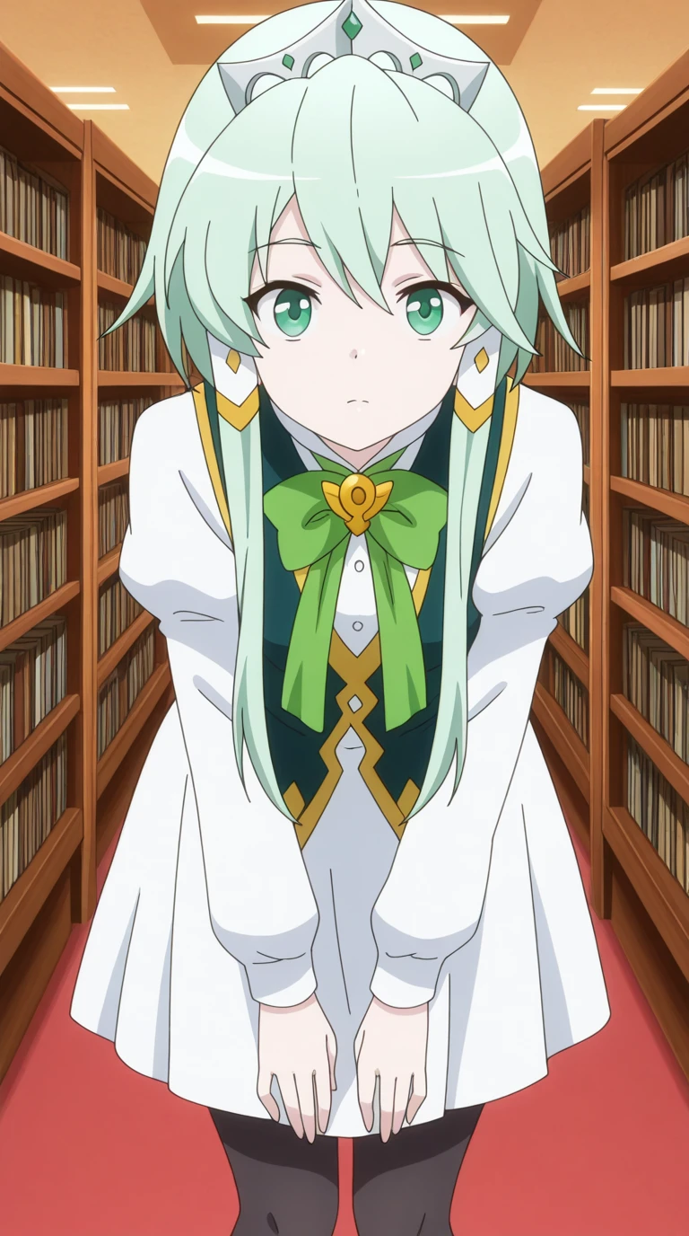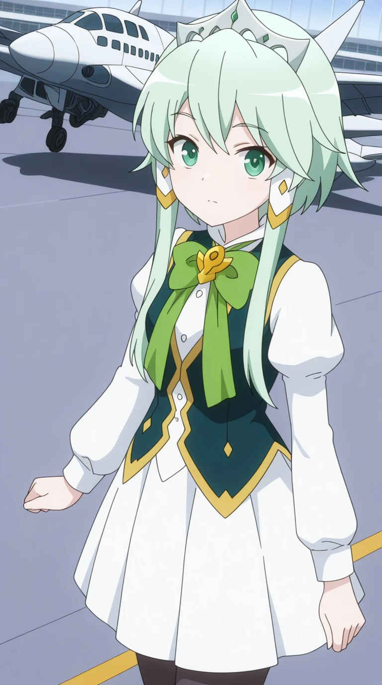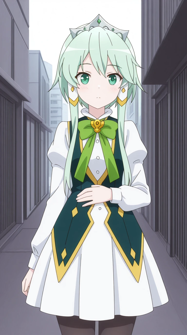 lucia rea regulus, long hair, green eyes, sidelocks, green hair, hair tubes, short hair with long locks, anime screencap