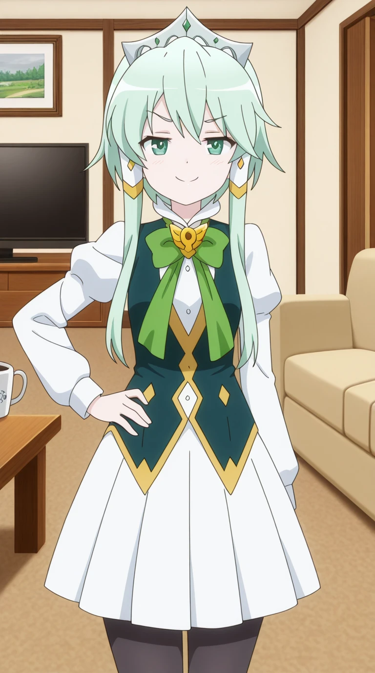 skirt, long sleeves, dress, bow, pantyhose, bowtie, black pantyhose, green bow,