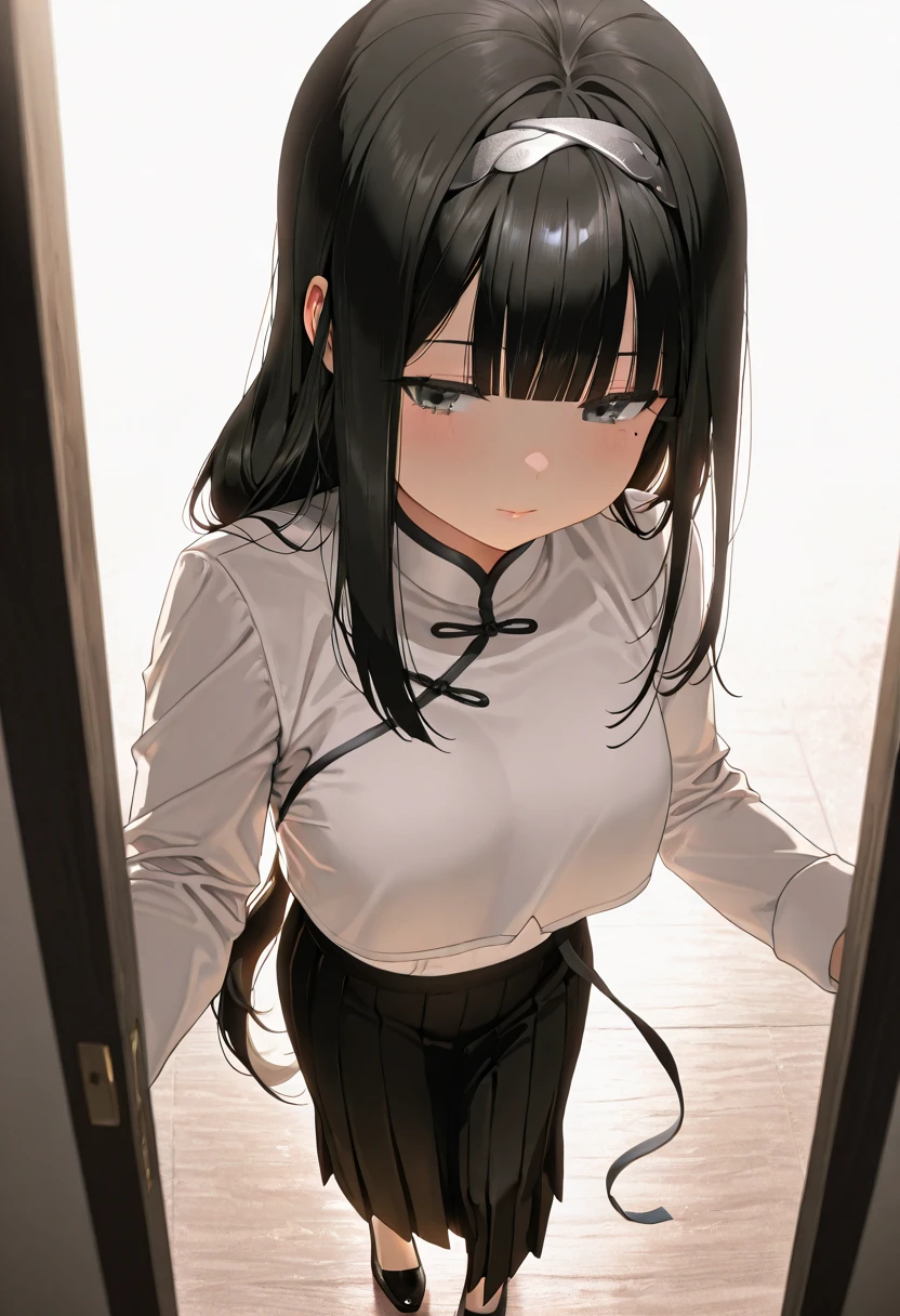 luqi, 1girl,grey eyes, black hair, low-tied long hair, solo, black skirt, black footwear, white shirt,long sleeves, pleated skirt, long skirt,hairband, blunt bangs, mole under eye,breast curtain