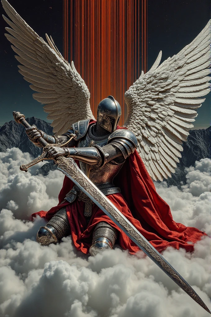1. Fantasy armored warriors with wings and swords, standing on cloud - capped mountains, red cloaks fluttering, huge swords reflecting sunlight, creating a majestic battle scene.