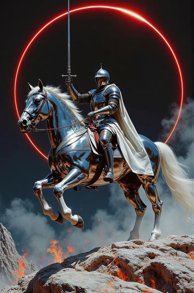 2. Fantasy armored warriors with wings and swords, riding a silver - armored warhorse, a red halo behind, charging on a desolate battlefield filled with broken armors.
