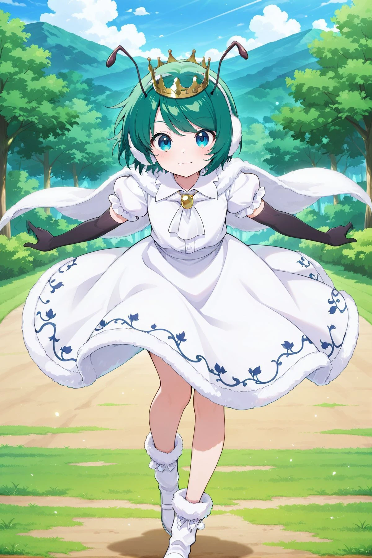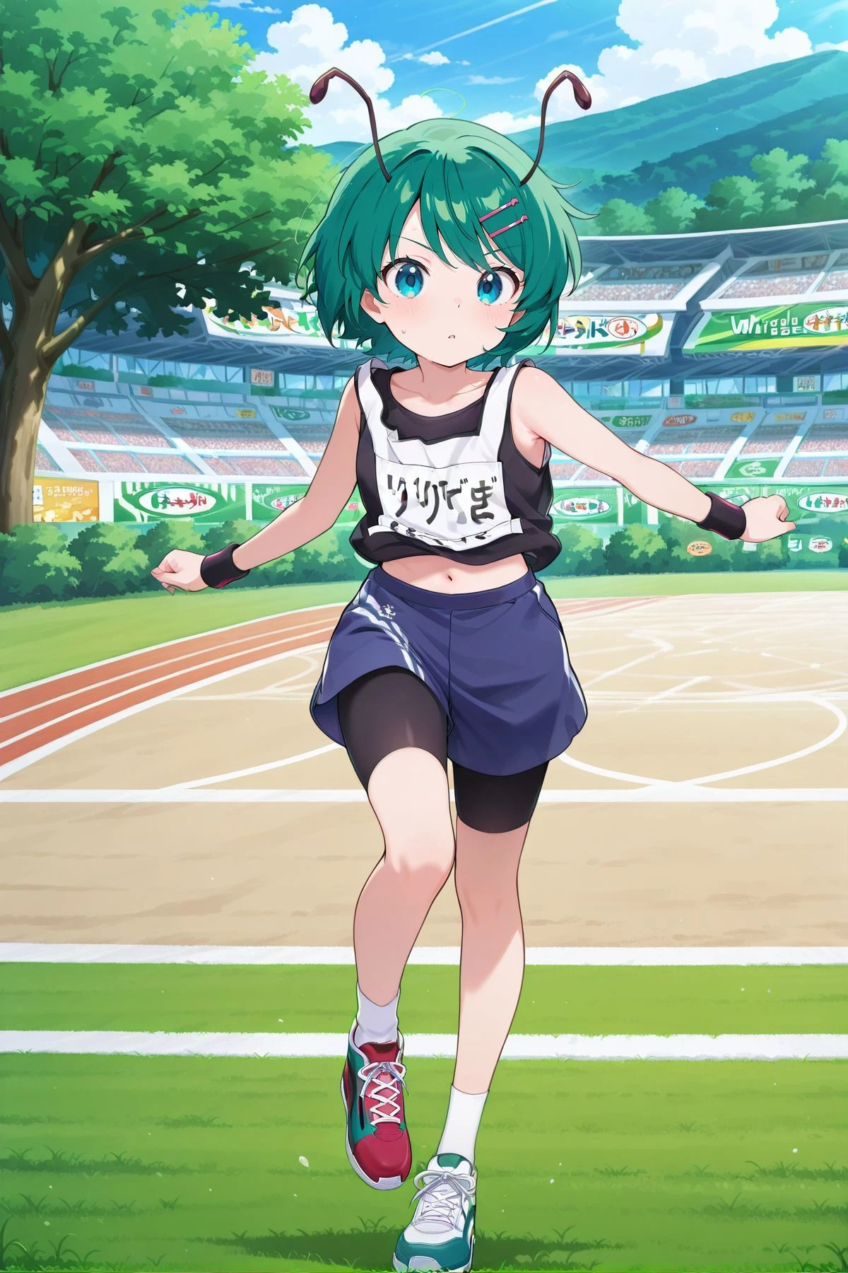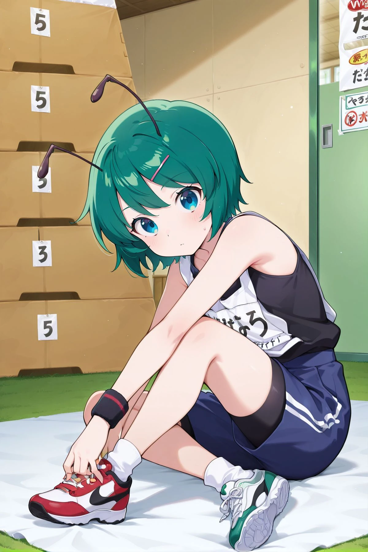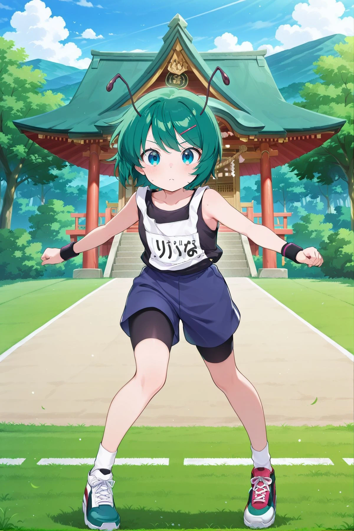 wriggle nightbug, 1girl, solo, blue eyes, green hair, short hair, antennae,, wriggle nightbug \(worm moon firefly\), alternate costume, multiple hairpins, gym uniform, race bib, white race bib, black shirt, sleeveless shirt, character print, wristband, blue shorts, short shorts, gym shorts, bike shorts under shorts, bike shorts, white socks, multicolored shoes, mismatched footwear, sneakers,wriggle nightbug, 1girl, solo, blue eyes, green hair, short hair, swept bangs, antennae,, wriggle nightbug \(fluttering white bug\), alternate costume, gold crown, earmuffs, white cape, fur cape, white ascot, gold pendant, white dress, floral dress, puffy short sleeves, elbow gloves, black gloves, fur-trimmed boots, white boots, holding flower,Wriggle Nightbug (Kaiju of Augmentation and Mutation) :