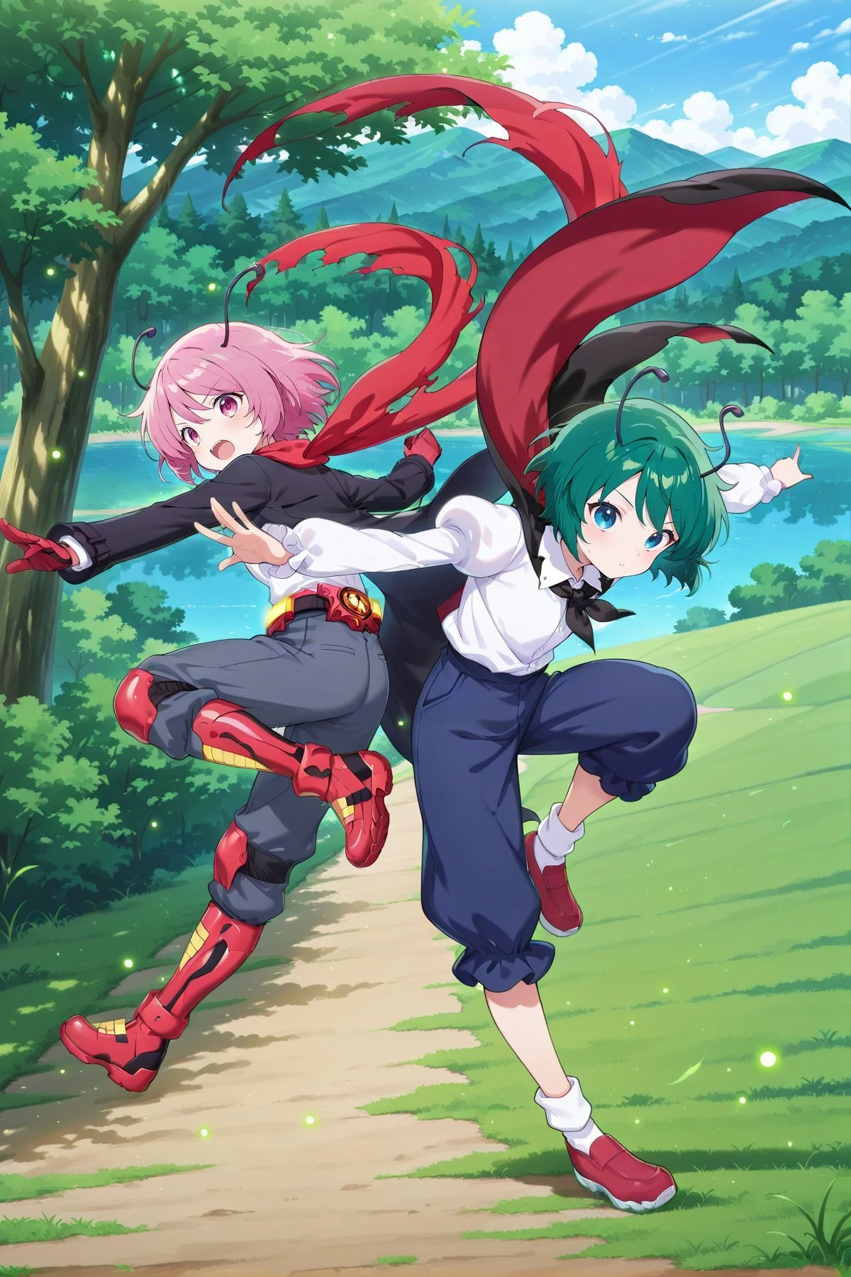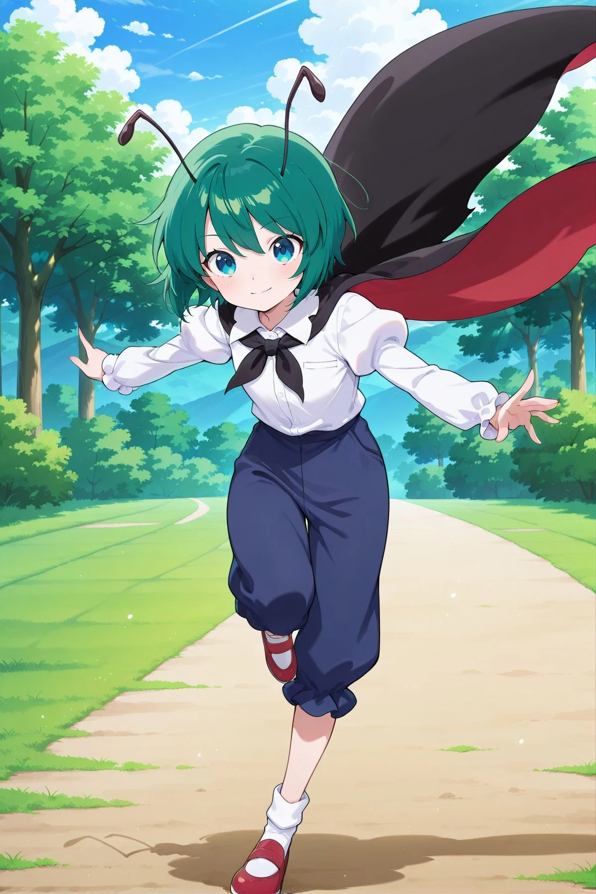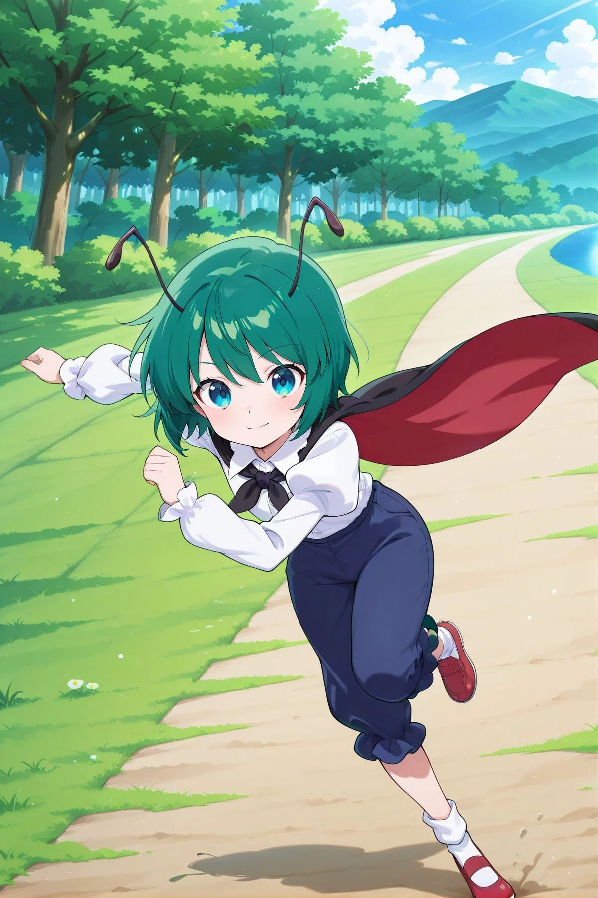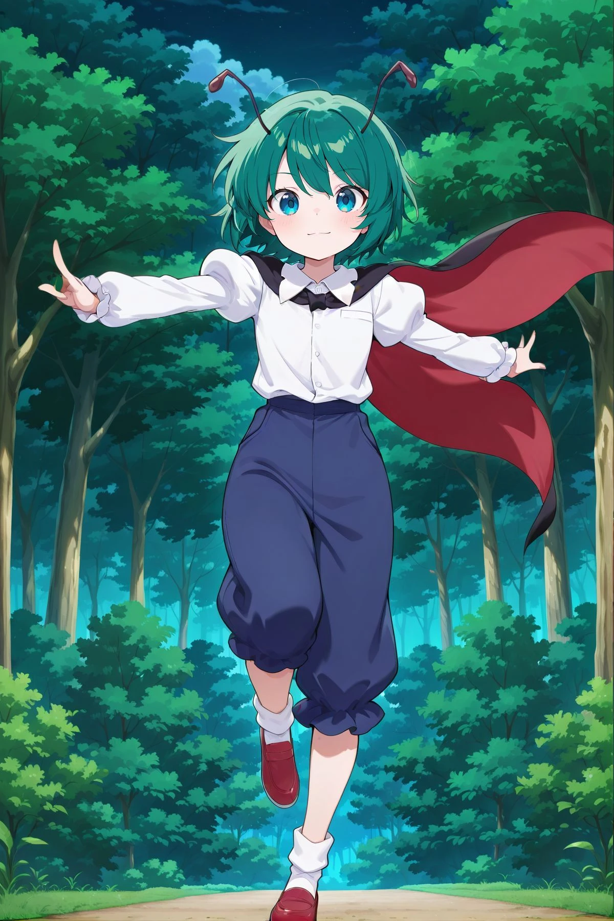 wriggle nightbug, 1girl, solo, blue eyes, green hair, short hair, antennae,two-sided cape, black cape, red cape, white shirt, collared shirt, puffy long sleeves, juliet sleeves, blue pants, white socks, red shoes,Alternative :