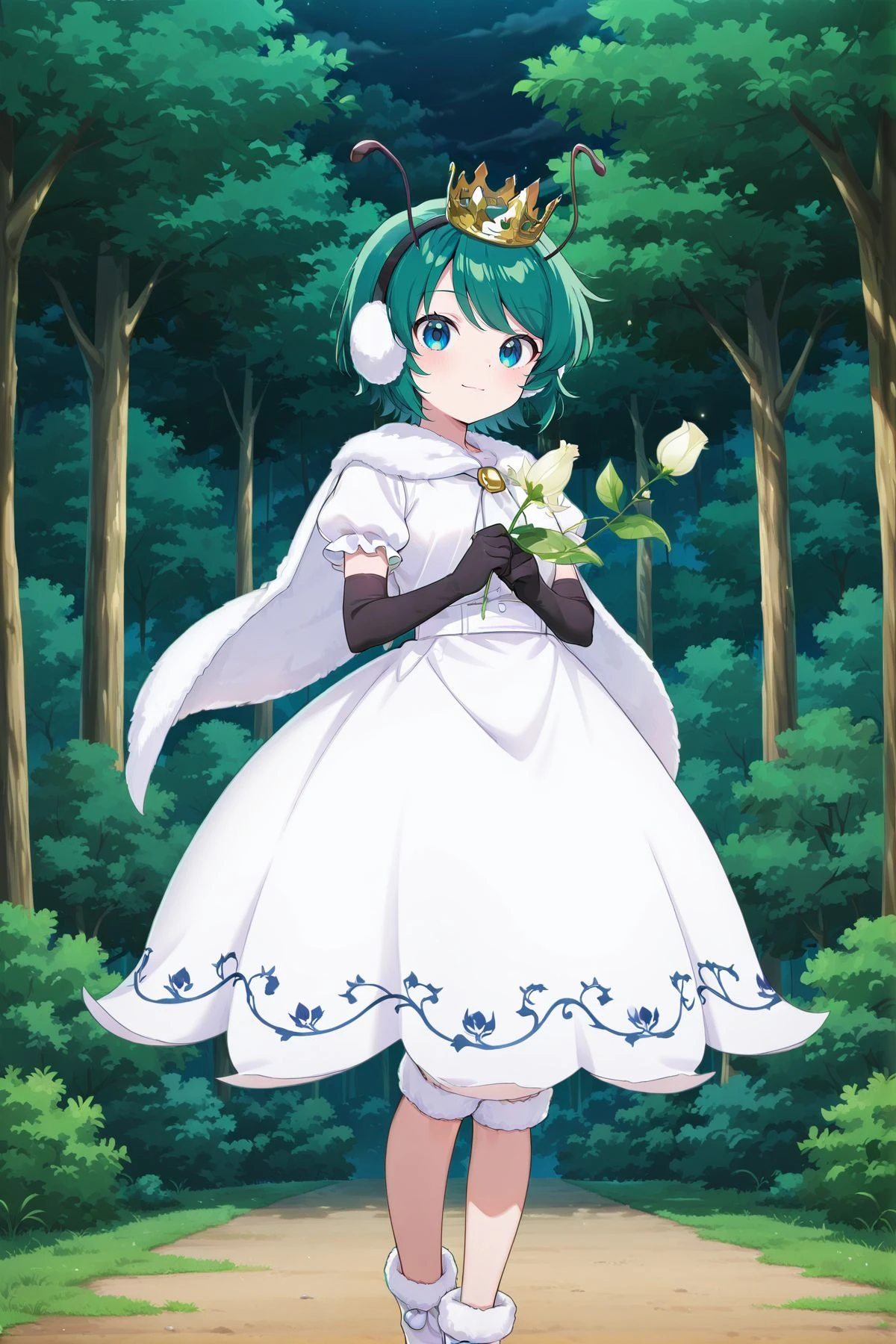 alternate costume, bellflower, black gloves, earmuffs, elbow gloves, floral dress, fur-trimmed footwear, (short cape, white cape, fur cape, fur trim cape:1.4), gloves, gold crown, holding flower, puffy short sleeves, puffy sleeves, white dress, white flower, white footwear, white necktie, Wriggle Nightbug (Kaiju of Augmentation and Mutation) :