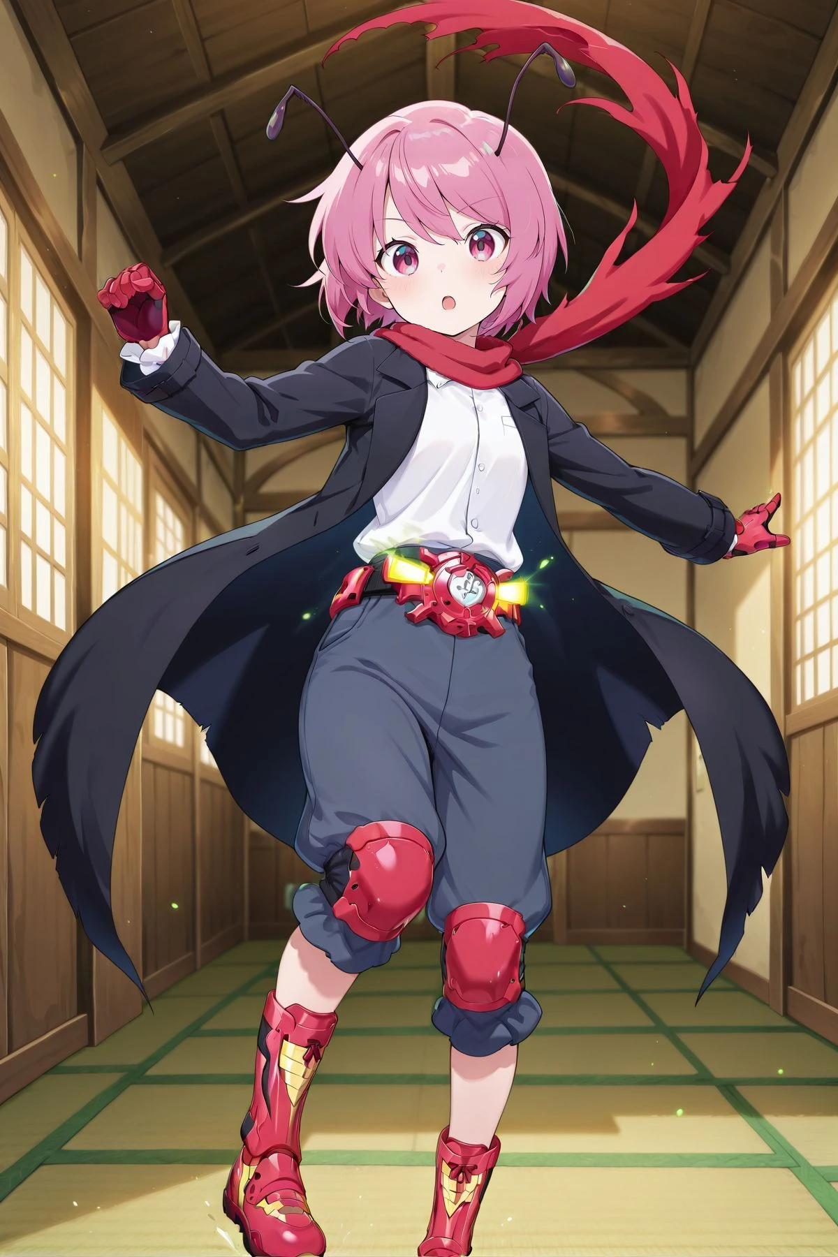 wriggle nightbug, 1girl, solo, pink eyes, pink hair, short hair, antennae,, wriggle nightbug \(kaiju of augmentation and mutation\), alternate costume, red scarf, torn scarf, black coat, open coat, long sleeves, white shirt, red gloves, armored gloves, rider belt, red belt, grey pants, knee pads, red pads, red boots, armored boots,Illustrious V1