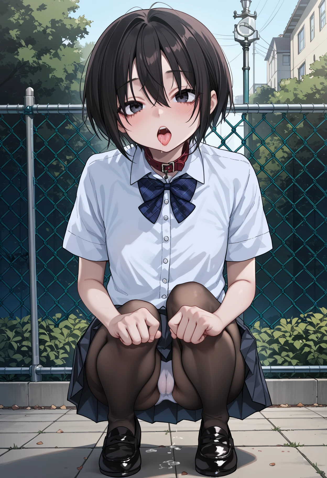衣装プロンプト(半袖)・s_clothes,short_sleeves,school uniform,plaid bowtie,black pleated skirt,black_pantyhose,black_loafers