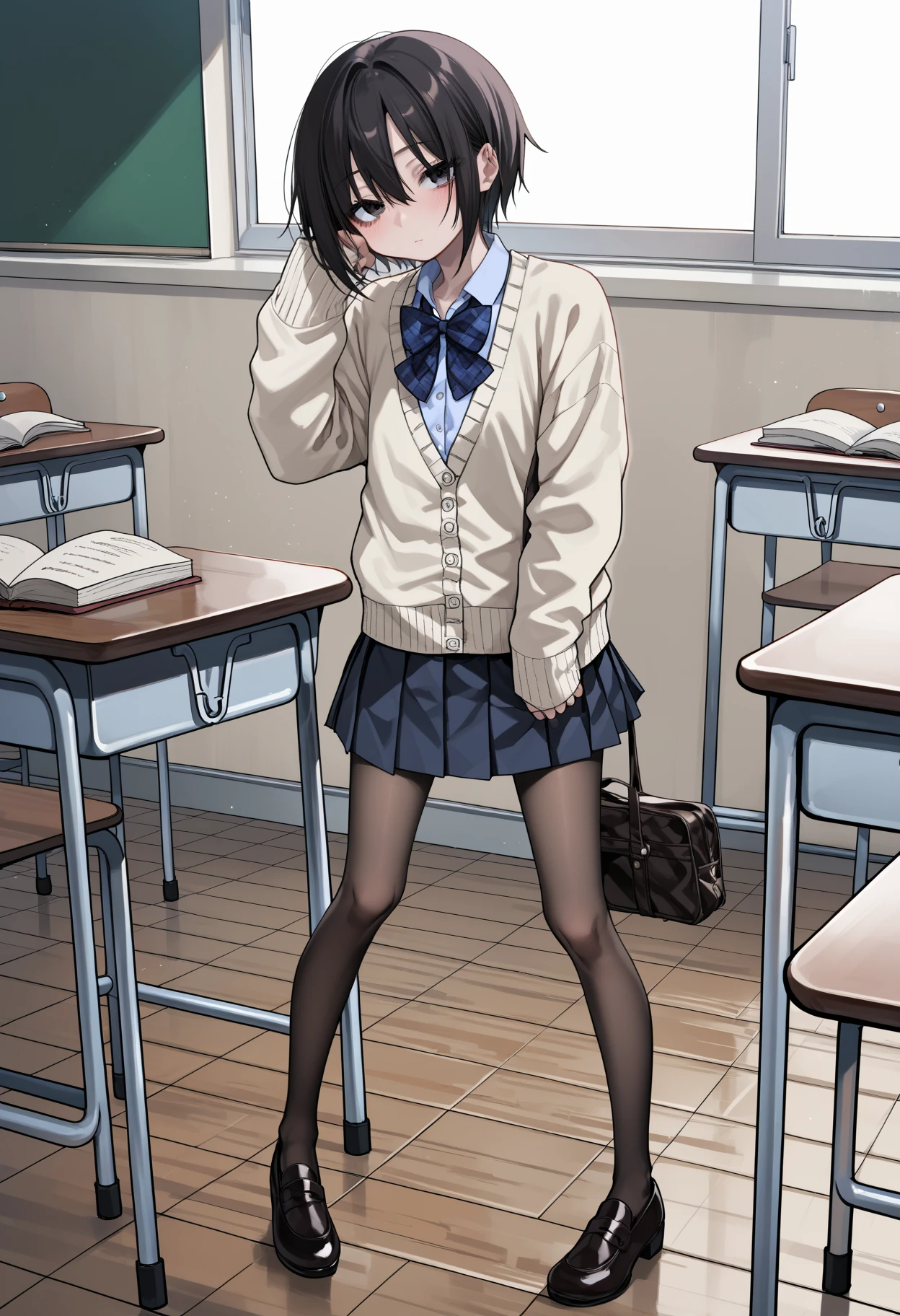 c_clothes,school uniform,plaid bowtie,cardigan,sleeves past wrists,black pleated skirt,black_pantyhose,uwabaki,