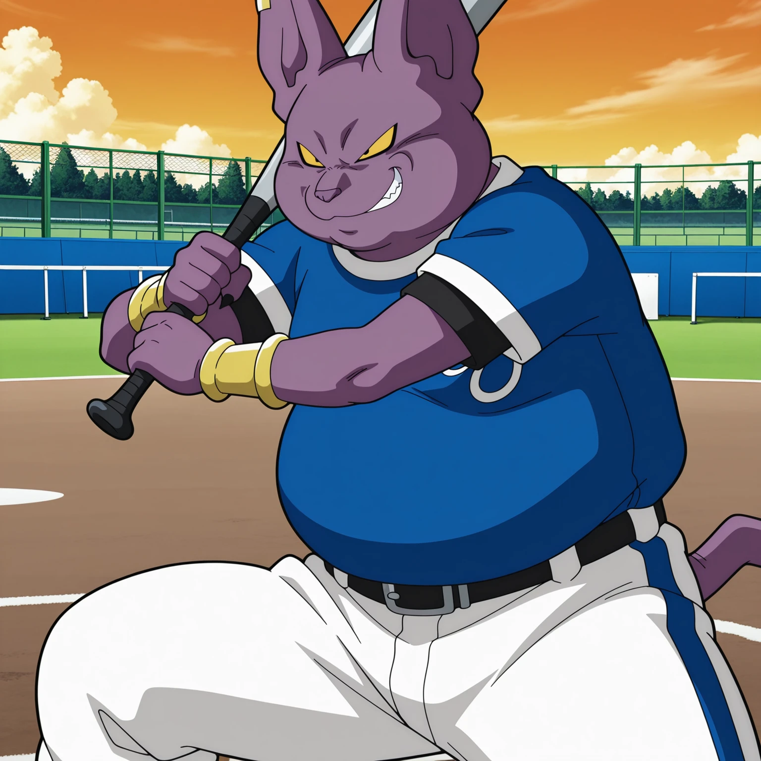 1boy, male, furry, anthro, cat, solo, purple skin, yellow sclera, black eyes, purple nose, pointed ears, fangs, sharp teeth, sharp nails, tail, fat, plump,