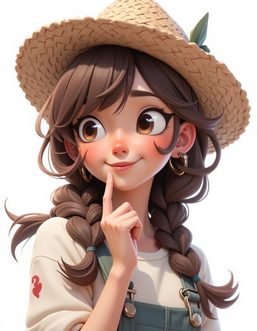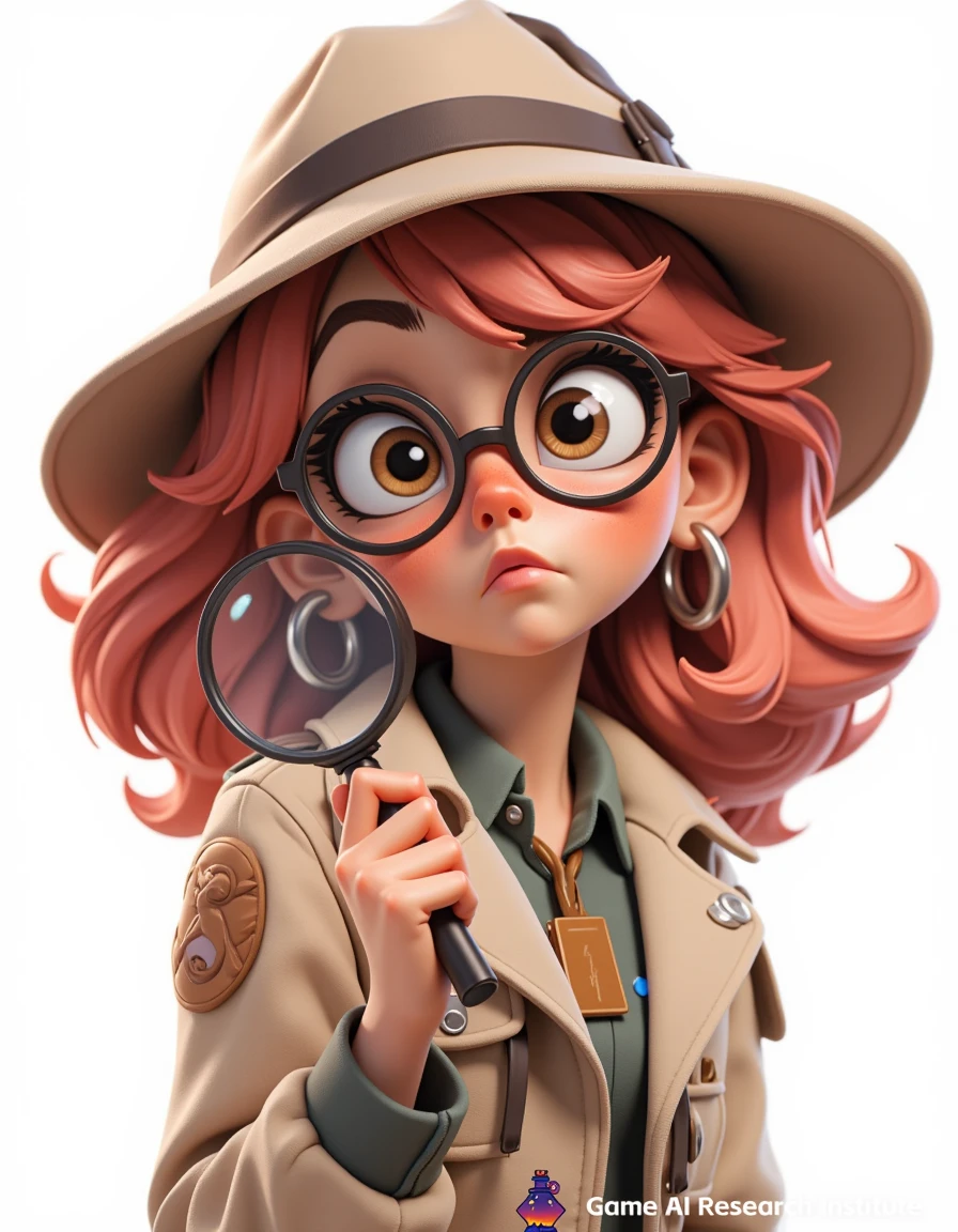 示例:gmic character_/(Game character/), A girl, with strawberry-colored blonde hair, holding a magnifying glass, in a detective costume and with a curious expression, Exaggerated expression,White background,Half-length portrait photo,Pixar style