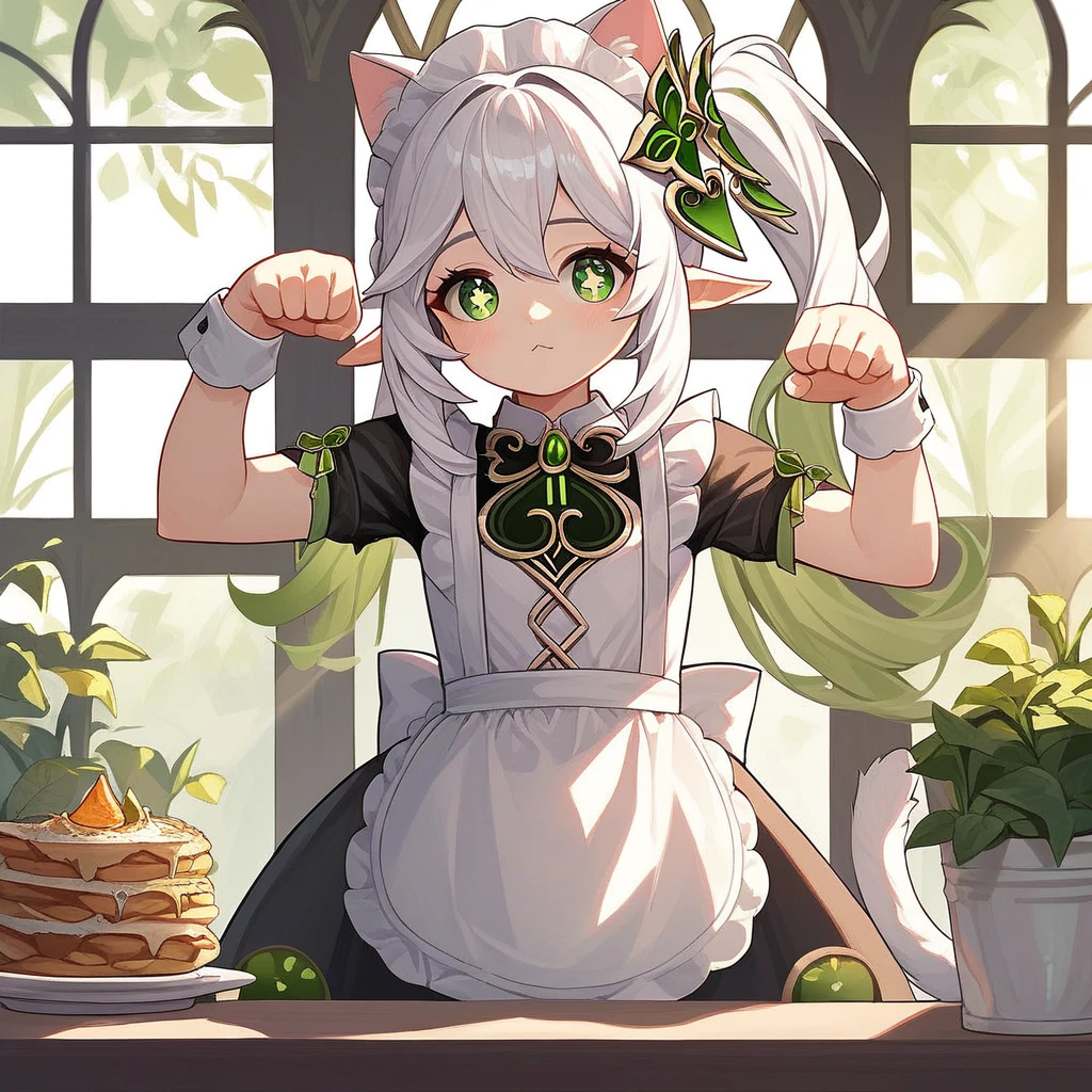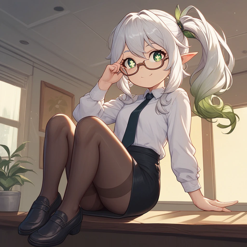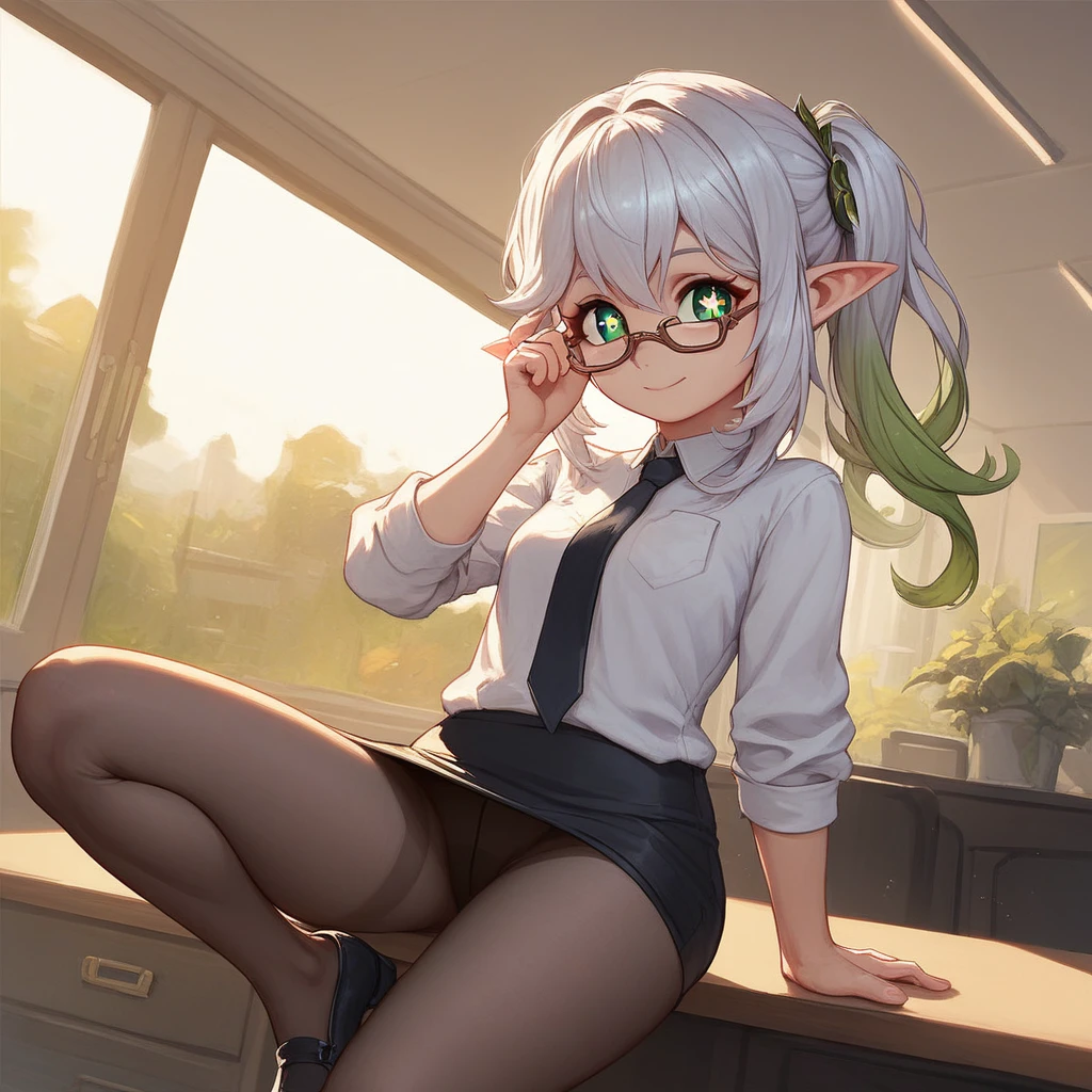 gradient hair, white hair, green eyes, symbol-shaped pupils, pointy ears, long hair, hair ornament, side ponytail,