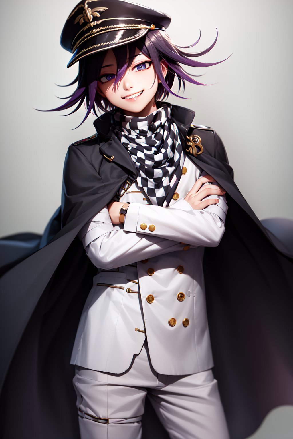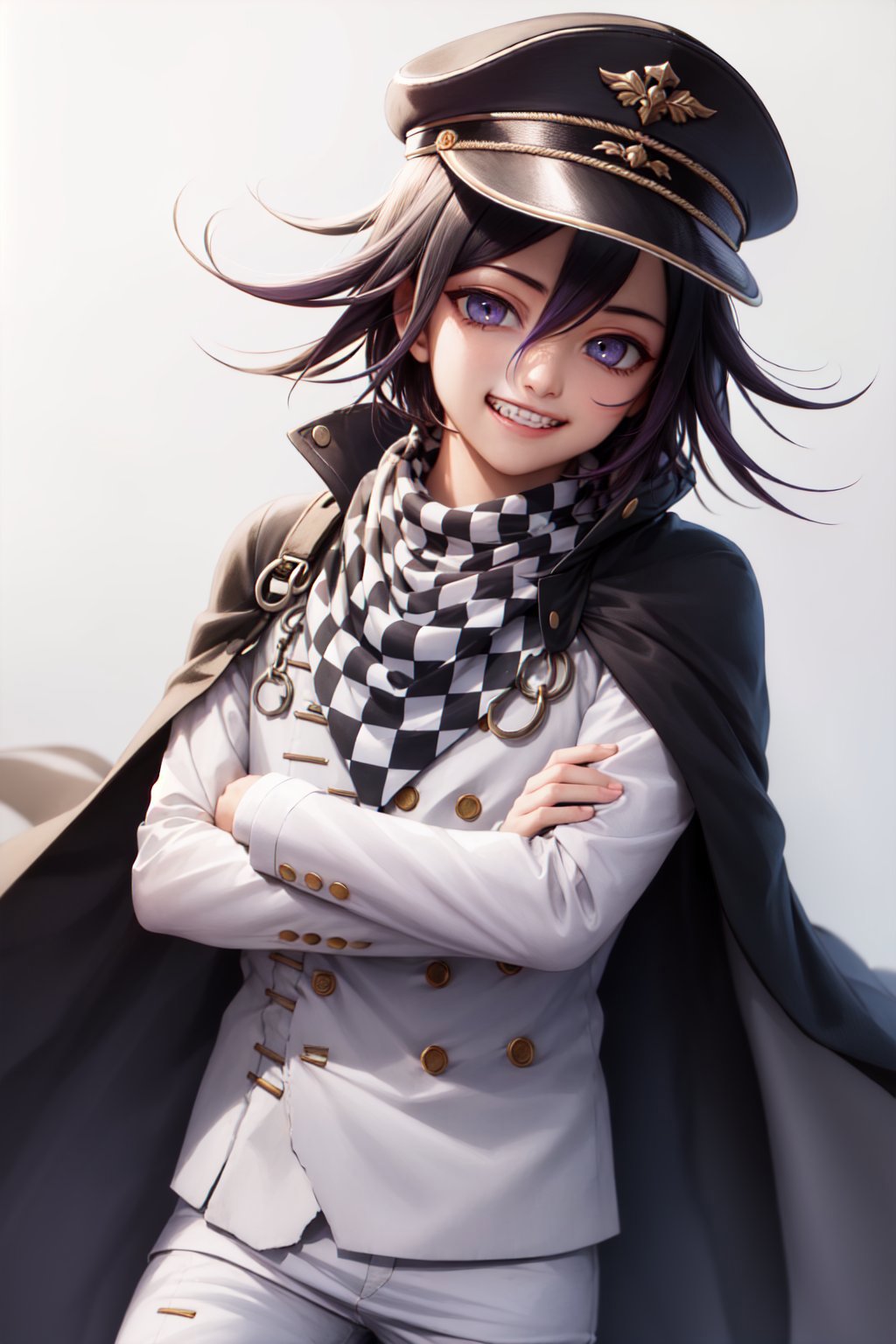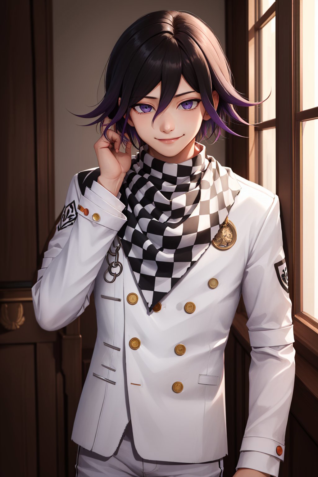 Default Outfit: jacket, buttons, white pants, checkered scarf