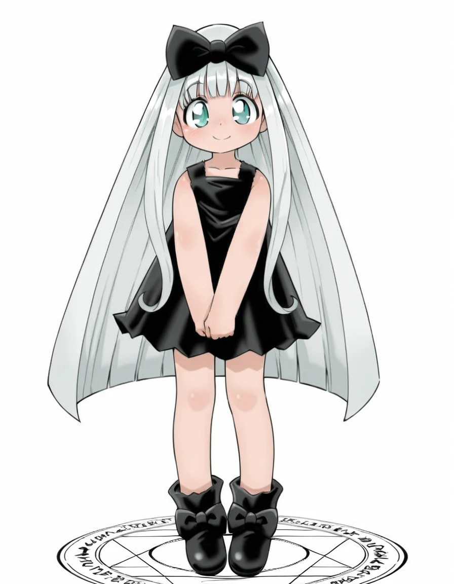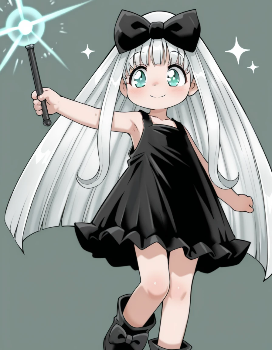 granite, child, long hair, green eyes, silver hair, very long hair, blunt bangs,hair ribbon, aqua eyes, dress, hair bow, skirt,ankle boots, sleeveless, black dress, , sleeveless dress, bow on boots