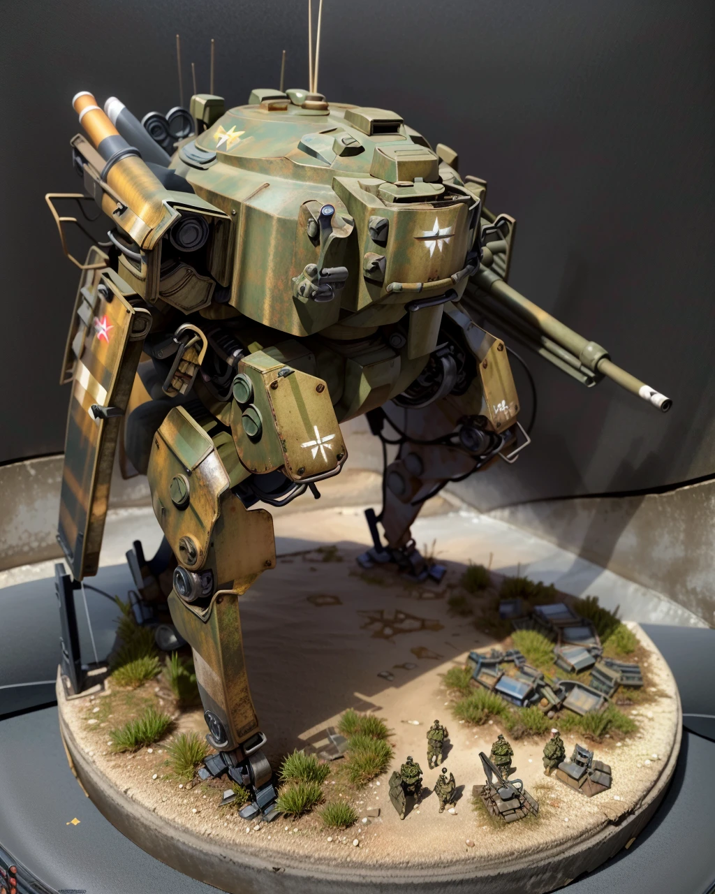 A retro sci-fi military robot with a tank's cannon. on head