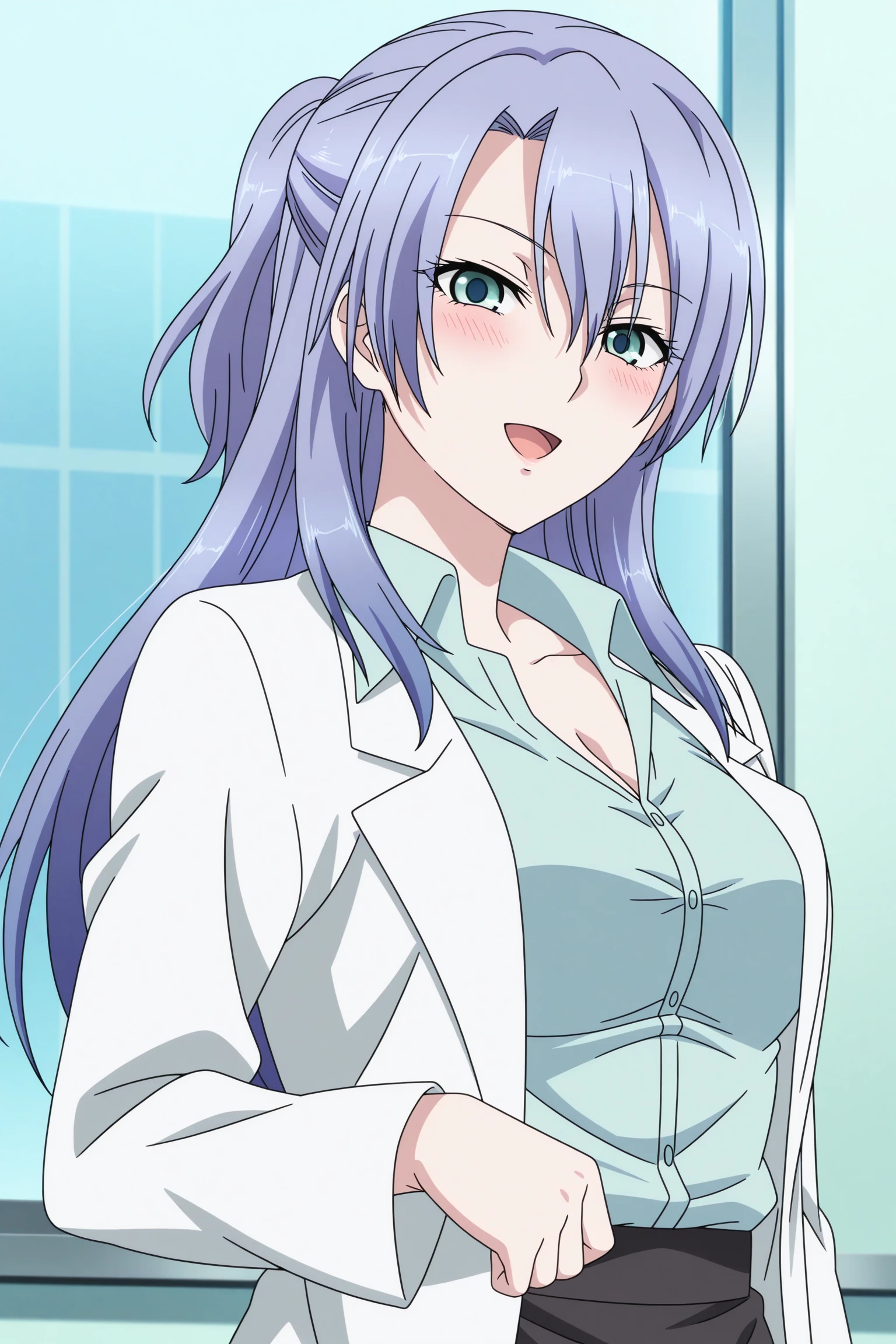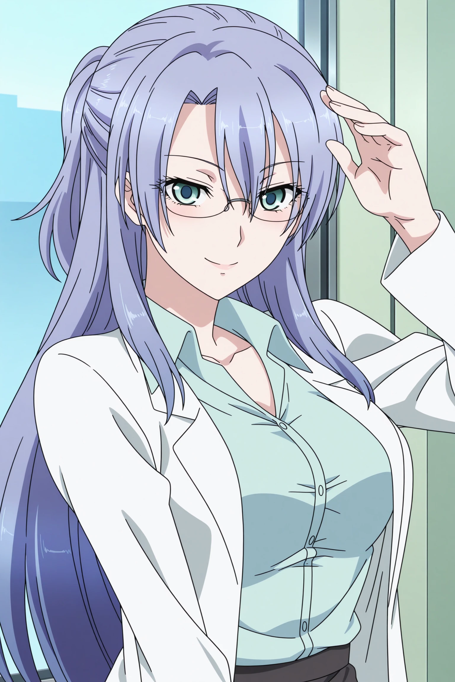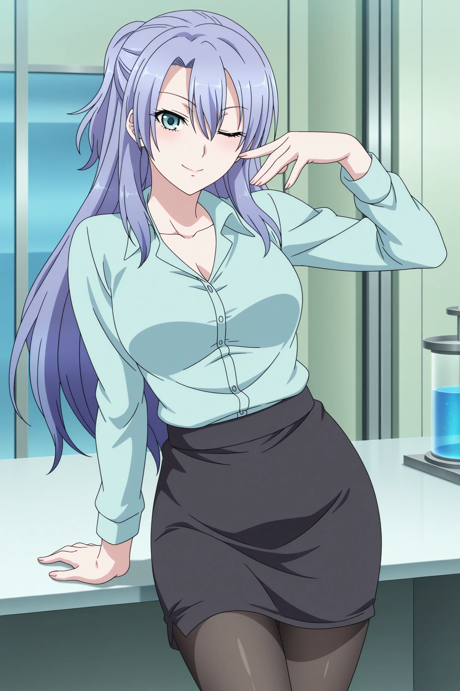 himuro ayame, long hair, purple hair, short ponytail, green eyes, long sleeves, lab coat, green shirt, collared shirt, black skirt, pencil skirt, black pantyhose, black footwear, high heels