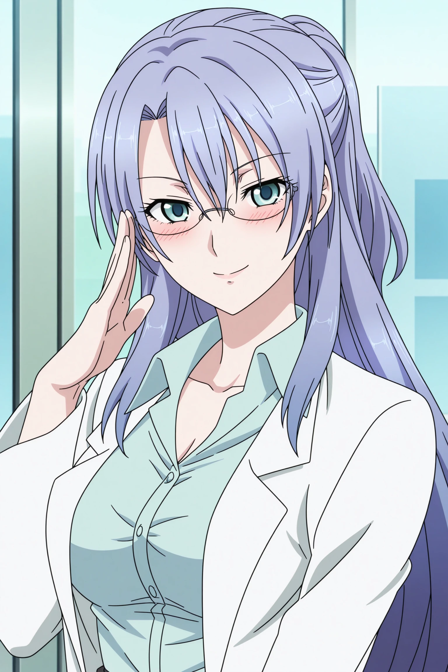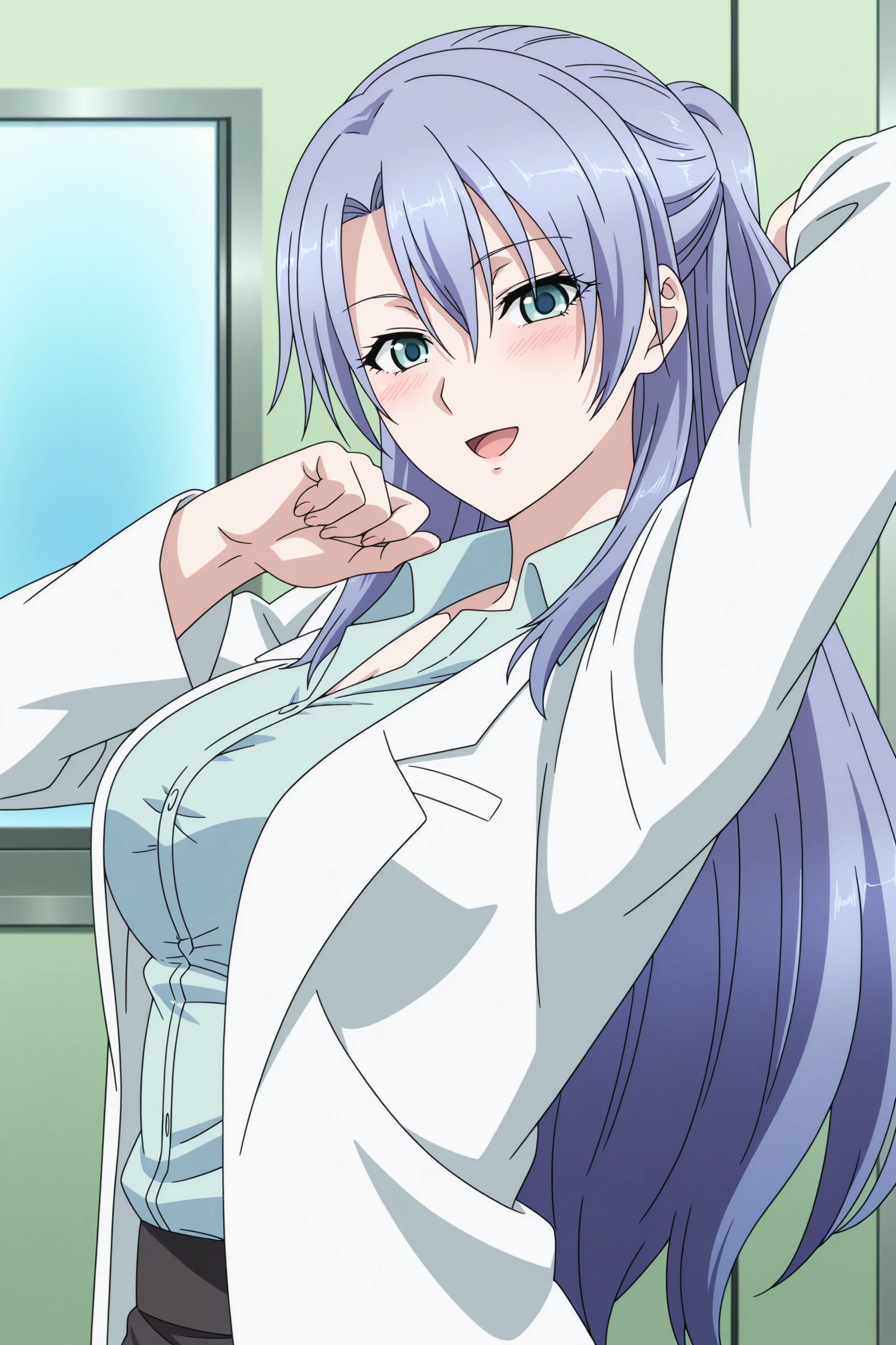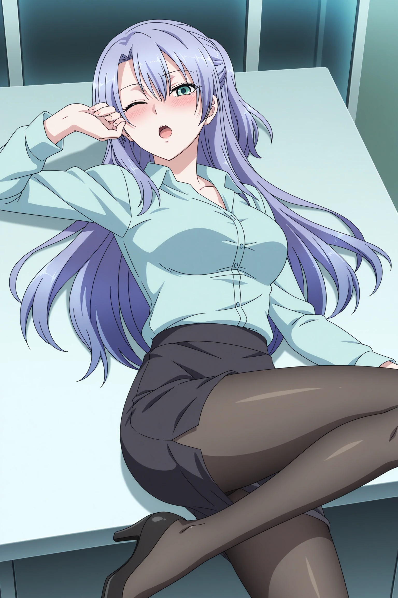 himuro ayame, long hair, purple hair, short ponytail, green eyes, long sleeves, lab coat, green shirt, collared shirt, black skirt, pencil skirt, black pantyhose, black footwear, high heels