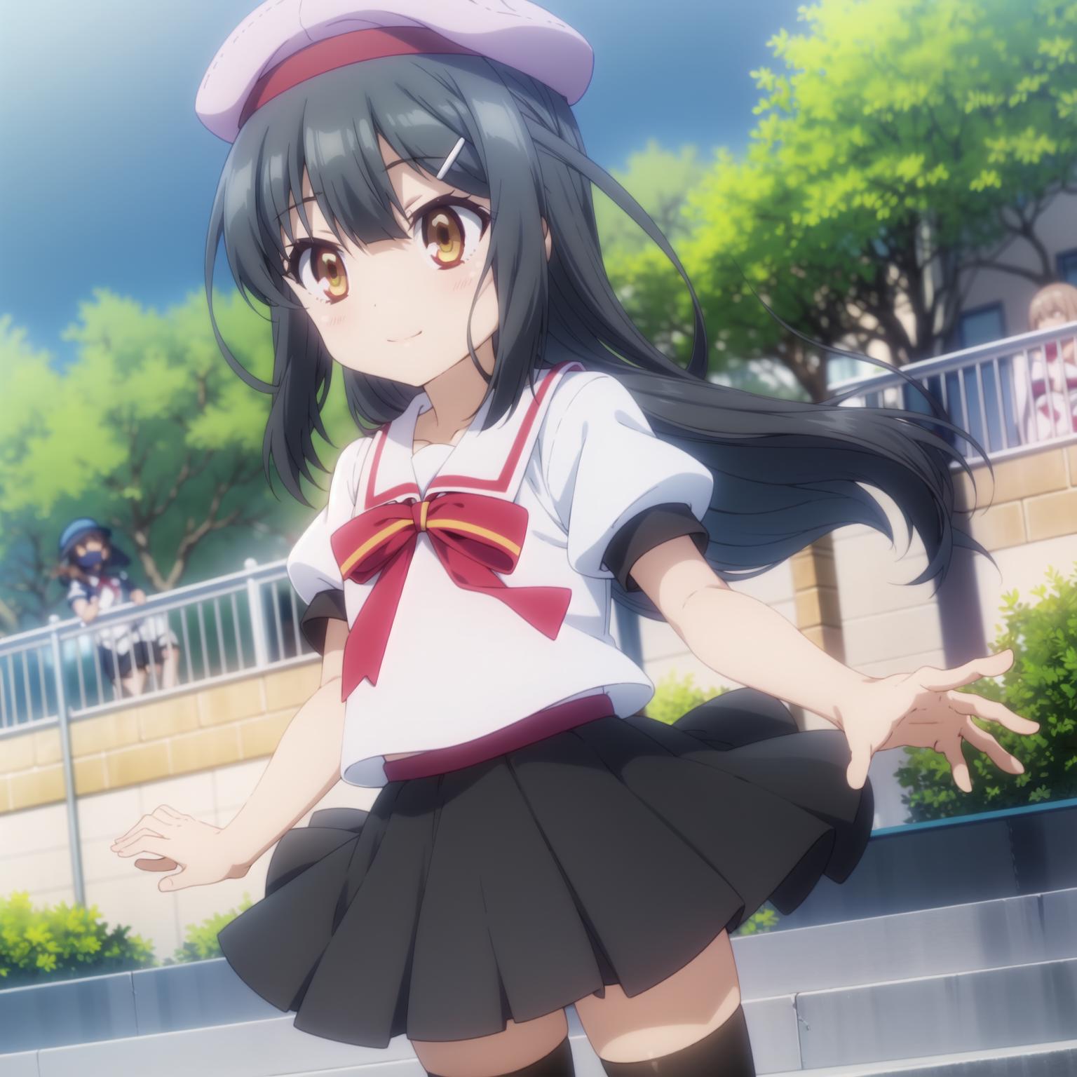 ,homurahara_academy_school_uniform,school_uniform,puffy_sleeves,short_sleeves,shirt,white_shirt,puffy_short_sleeves,black_skirt,pleated_skirt,ribbon,neck_ribbon,thighhighs,black_thighhighs,hat,brown_headwear,baret,