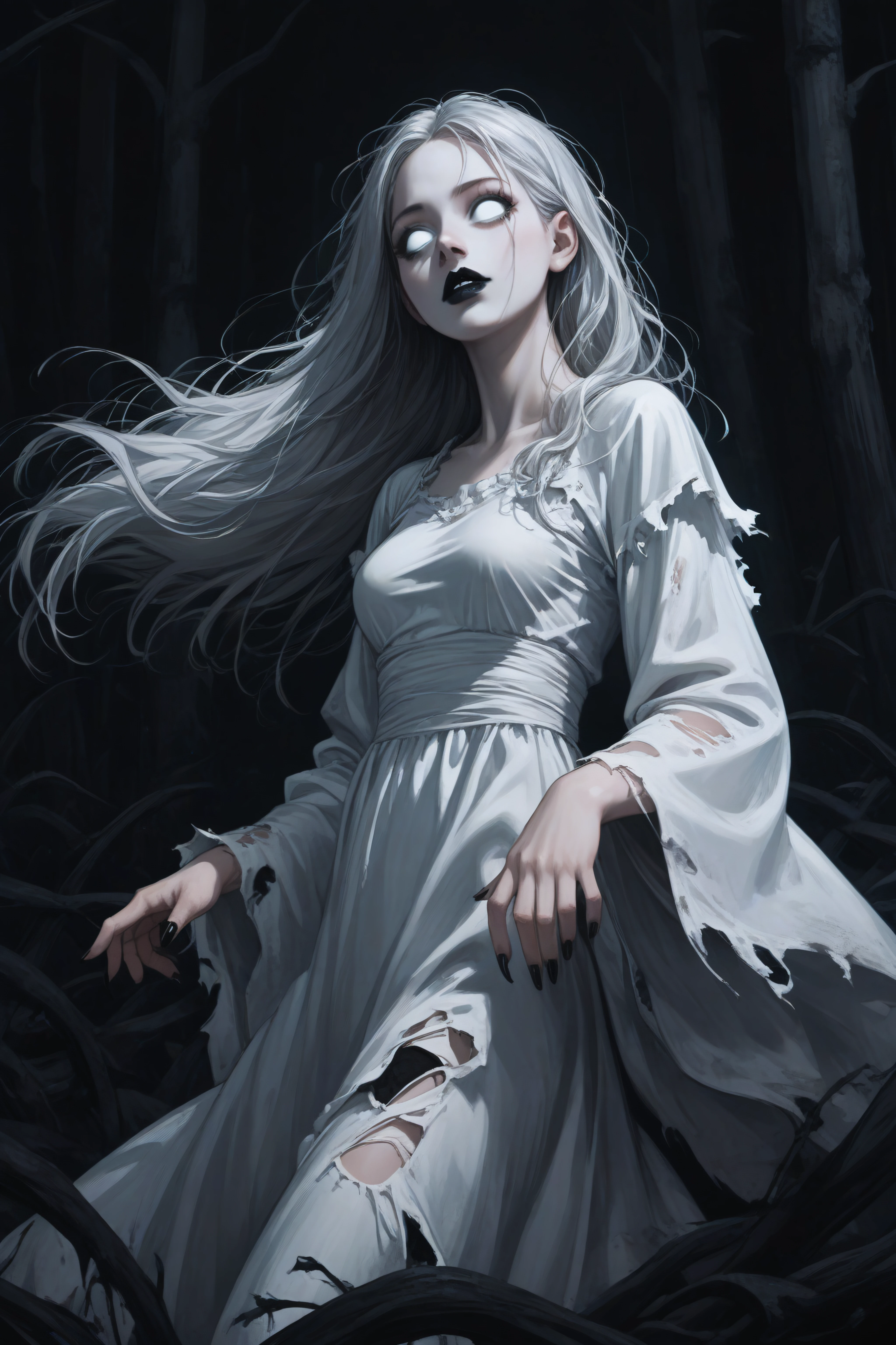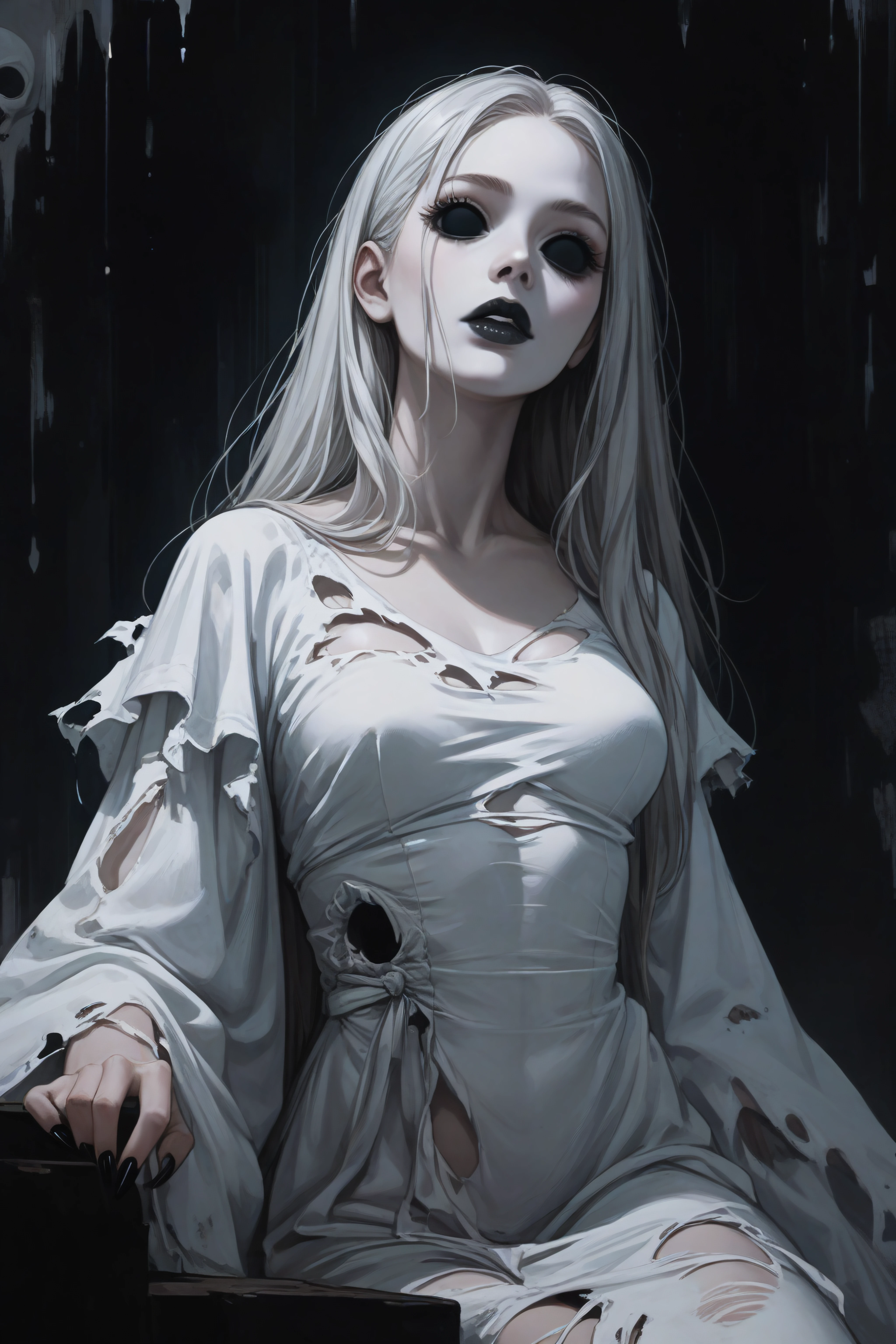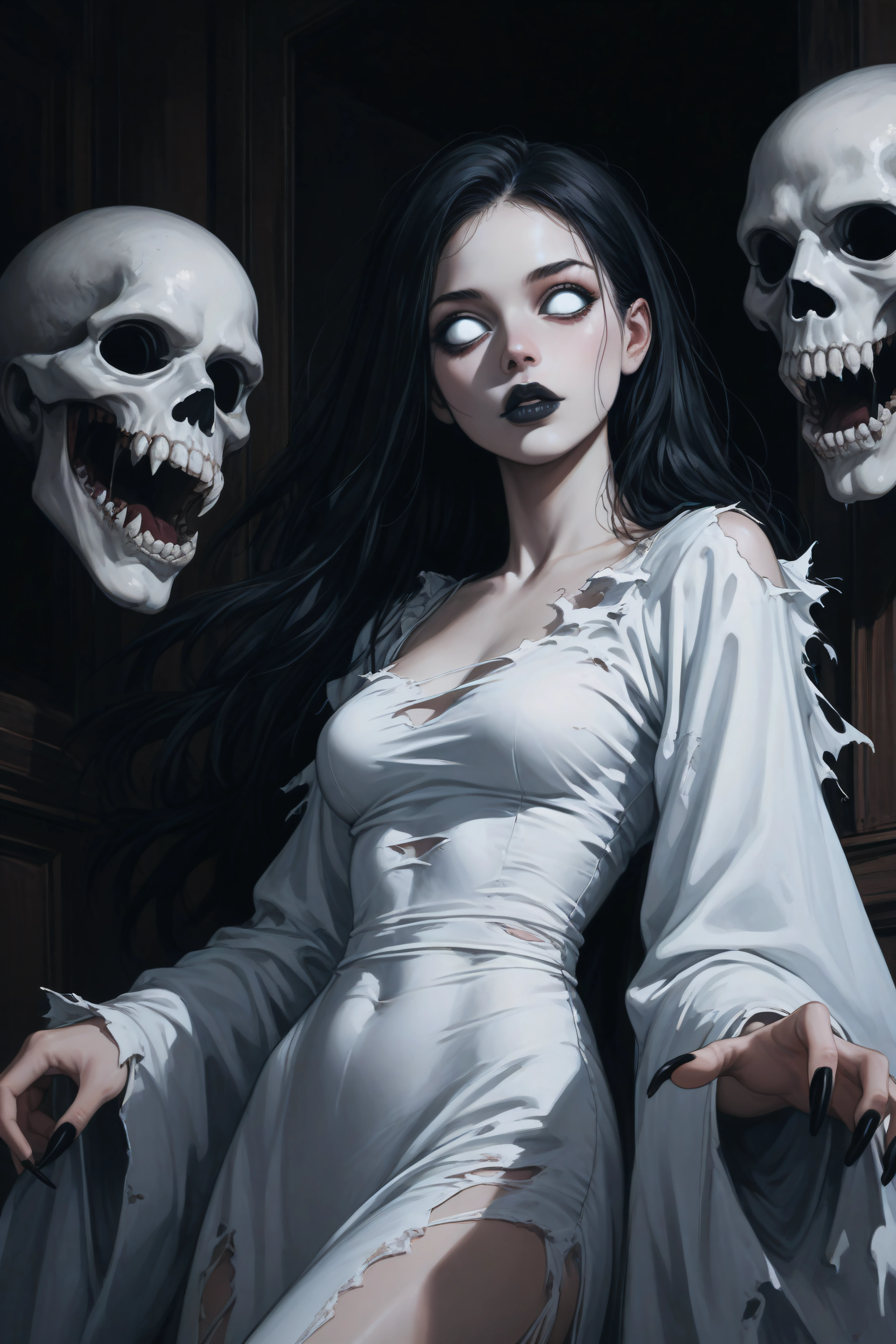 banshee, 1girl, blank eyes, long hair, medium breasts, pale skin, black lips, long fingernails, black fingernails, white dress, long sleeves, wide sleeves, torn clothes, horror \(theme\),