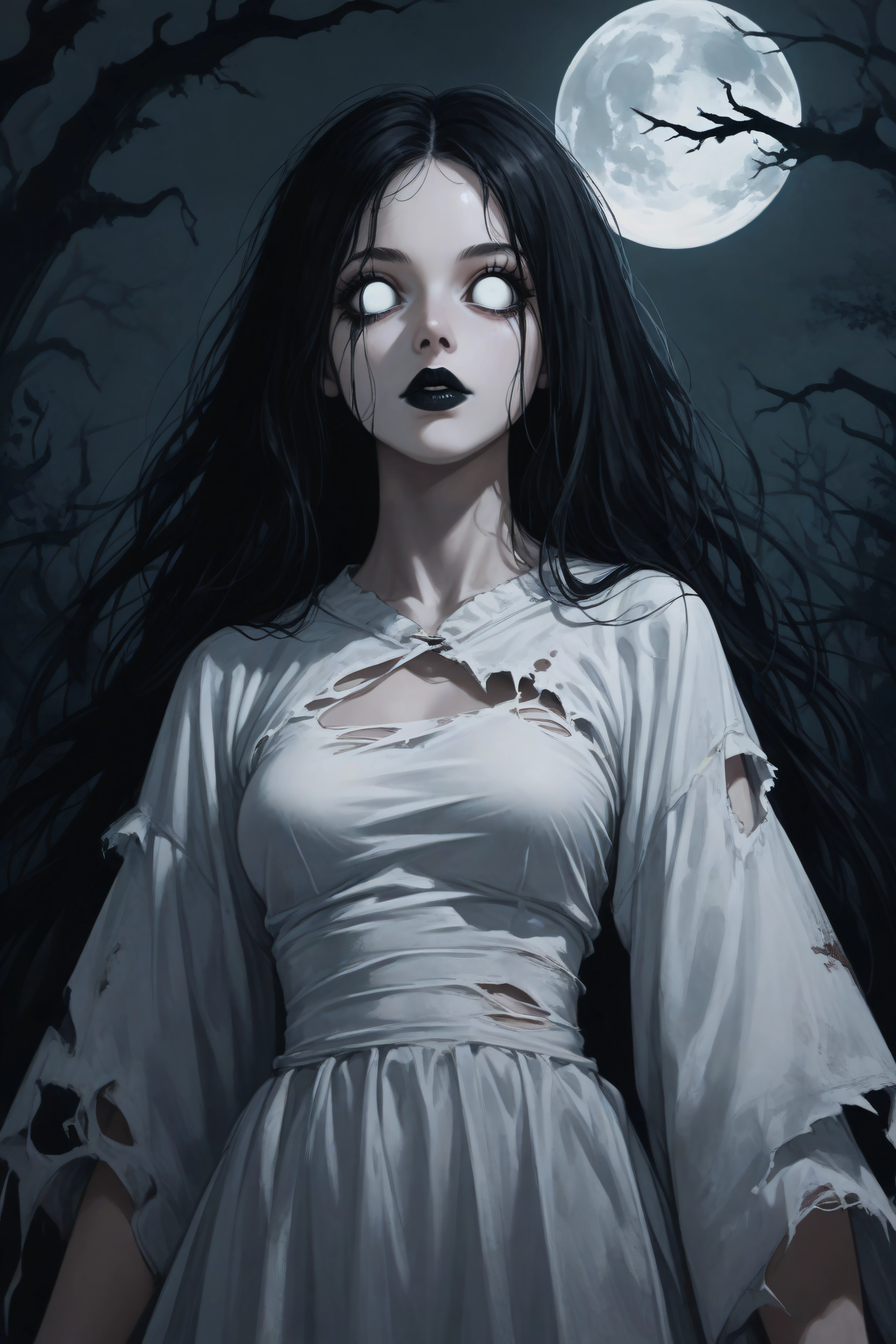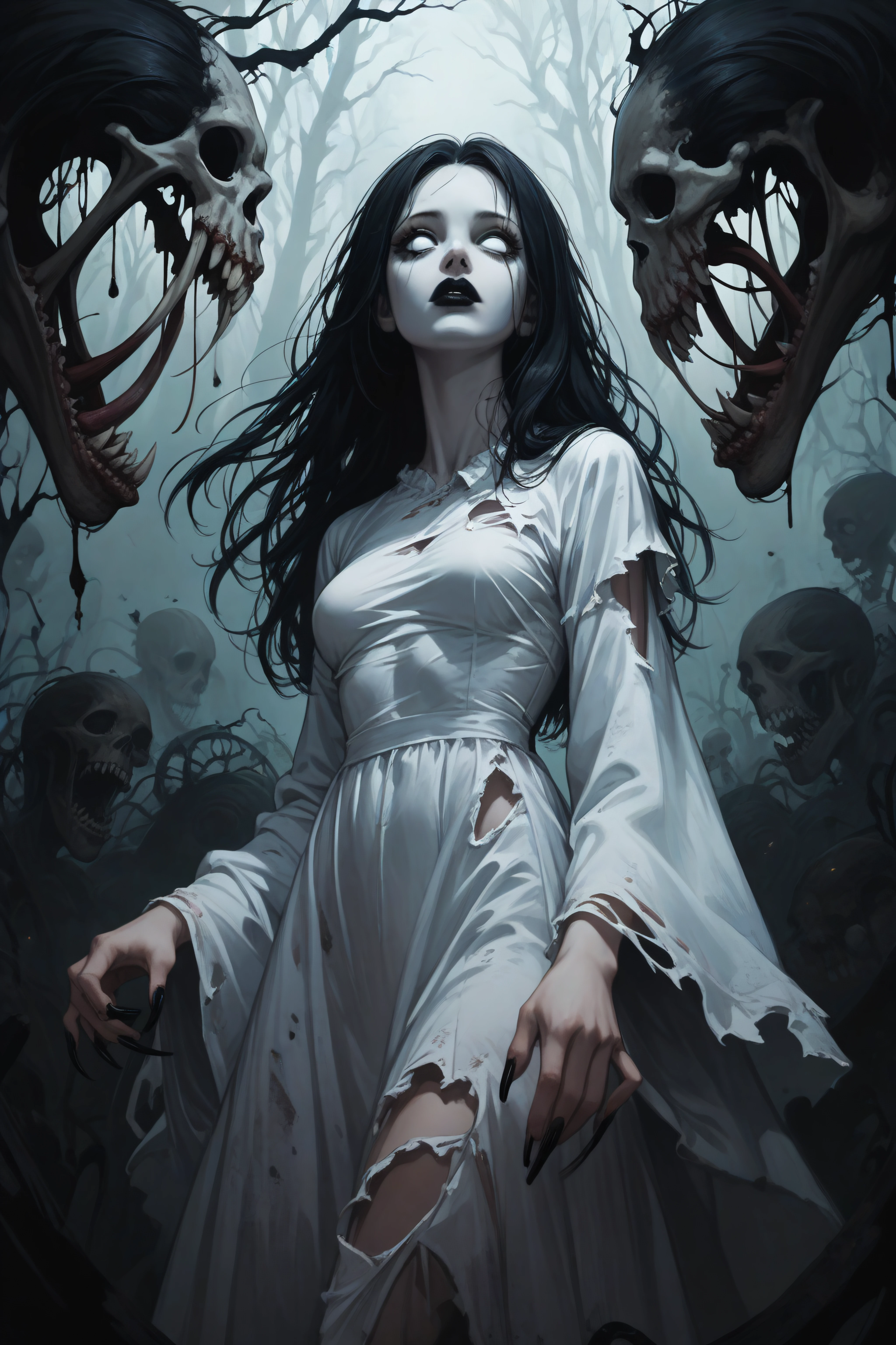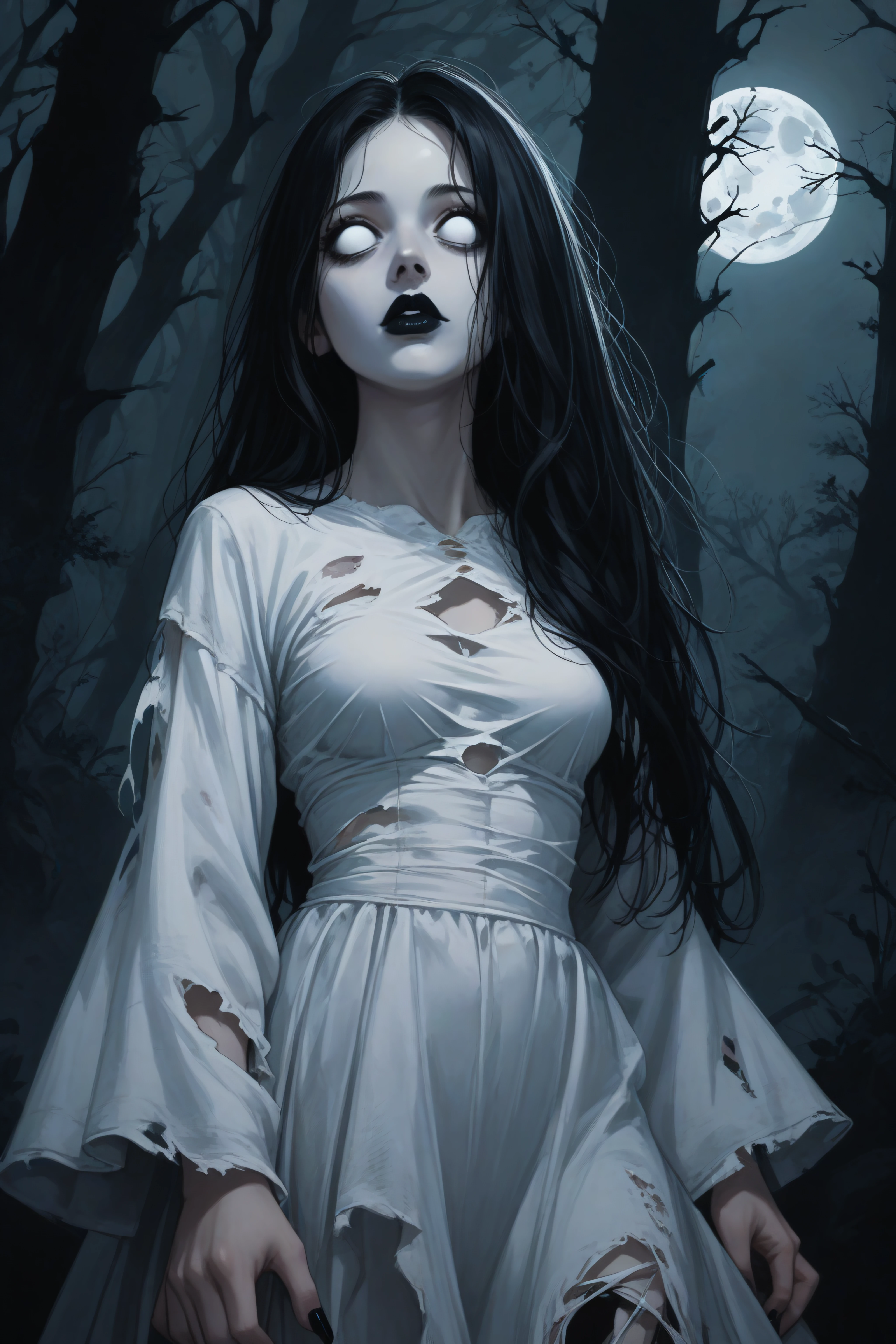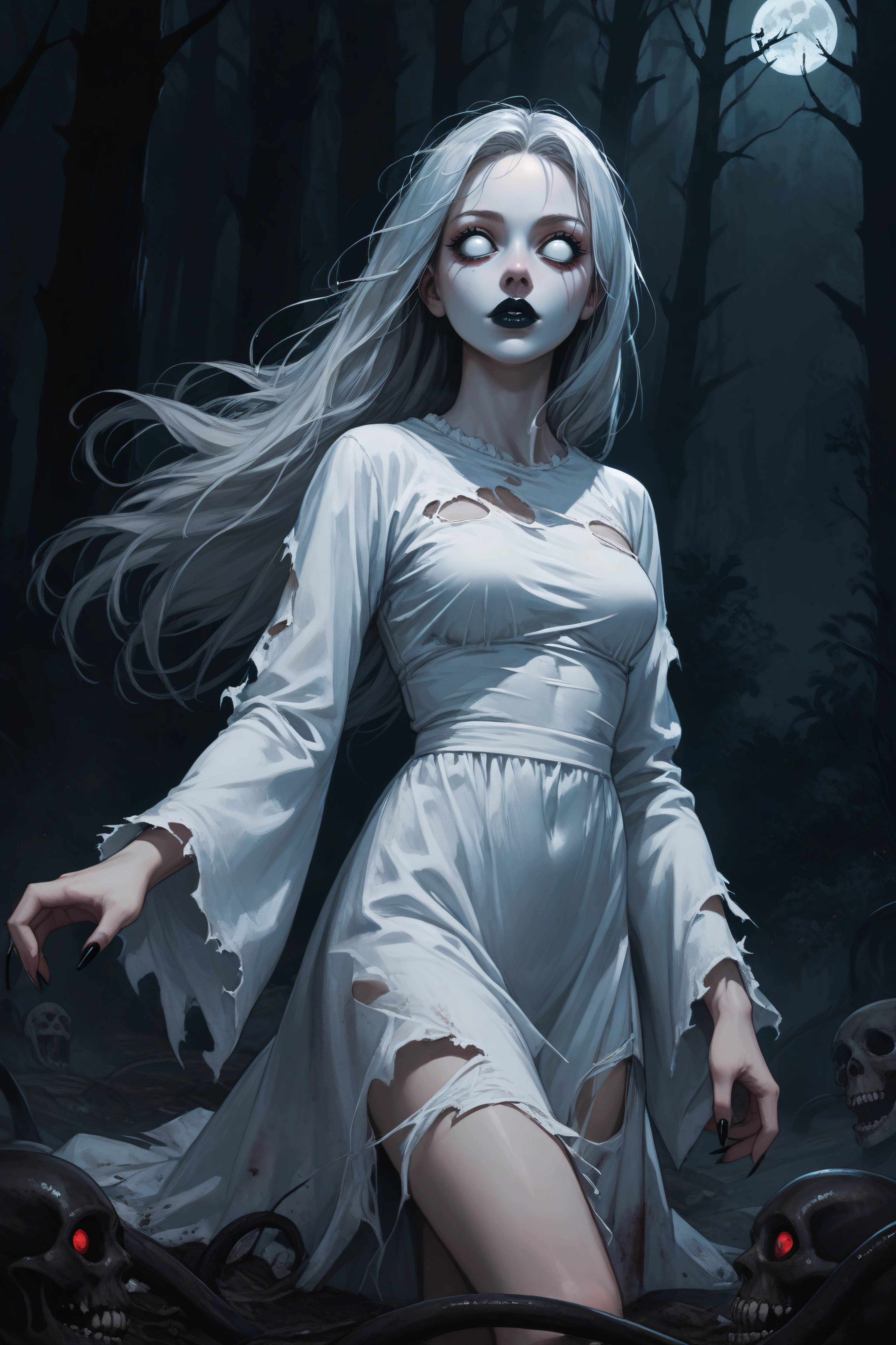 banshee, 1girl, blank eyes, long hair, medium breasts, pale skin, black lips, long fingernails, black fingernails, white dress, long sleeves, wide sleeves, torn clothes, horror \(theme\),