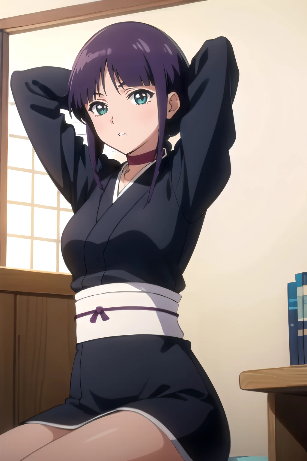 japanese clothes, choker, black kimono, arm guards, short kimono (except from the hips upwards), socks, sandals