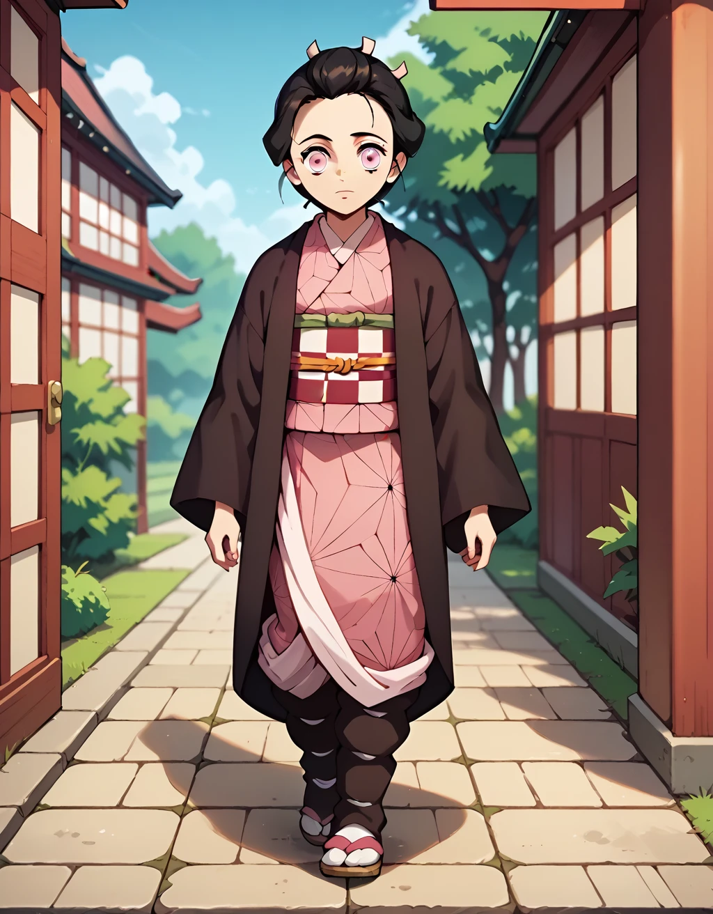 Human: NezukoHum, kamado nezuko, 1girl, short hair, black hair, haori, pink kimono, checkered sash, obi, wide sleeves, long sleeves,